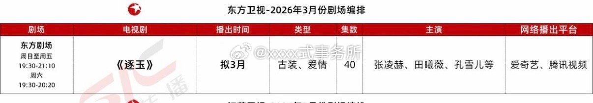张凌赫 田曦薇逐玉,3月同步上星东方卫视