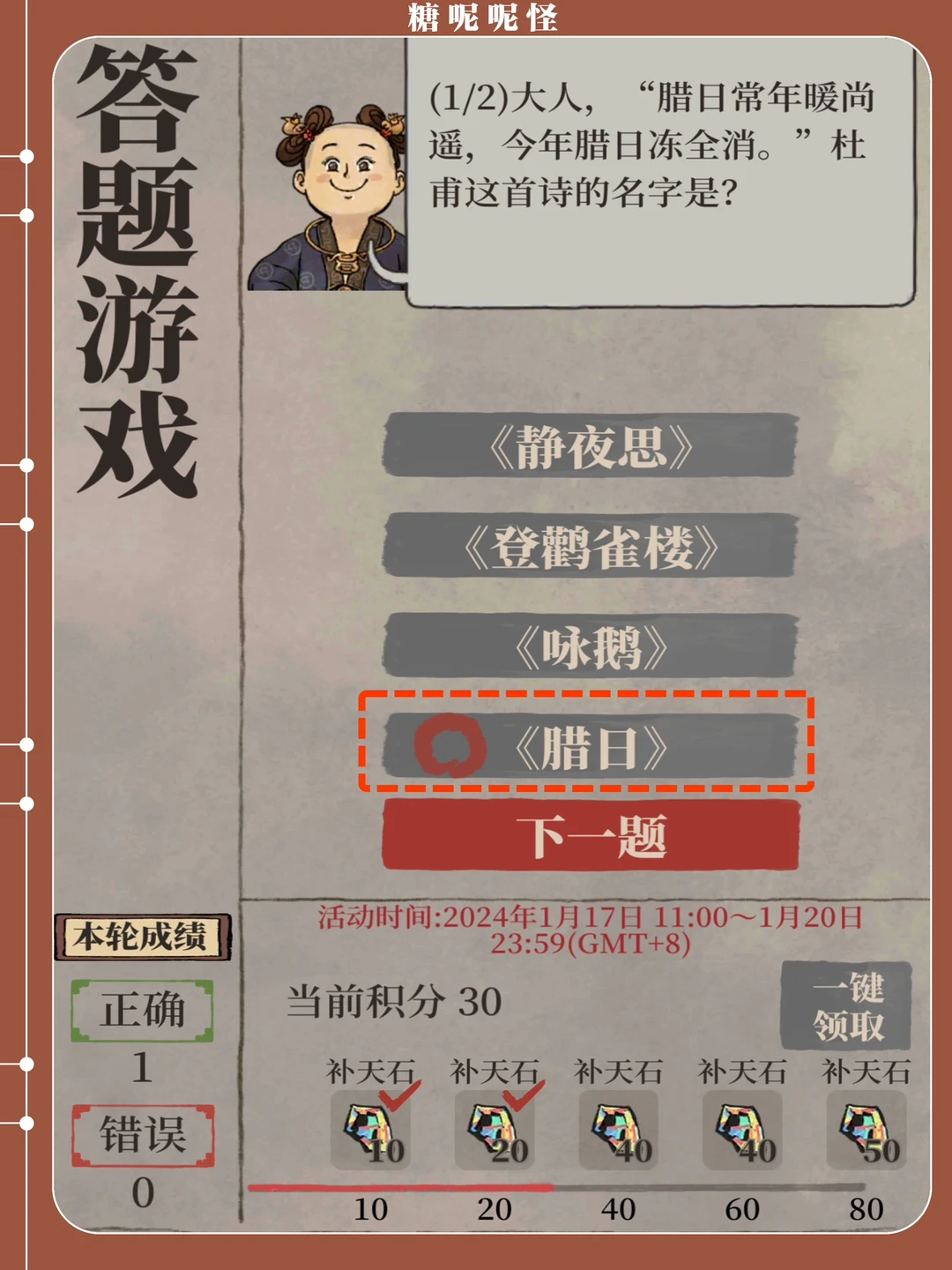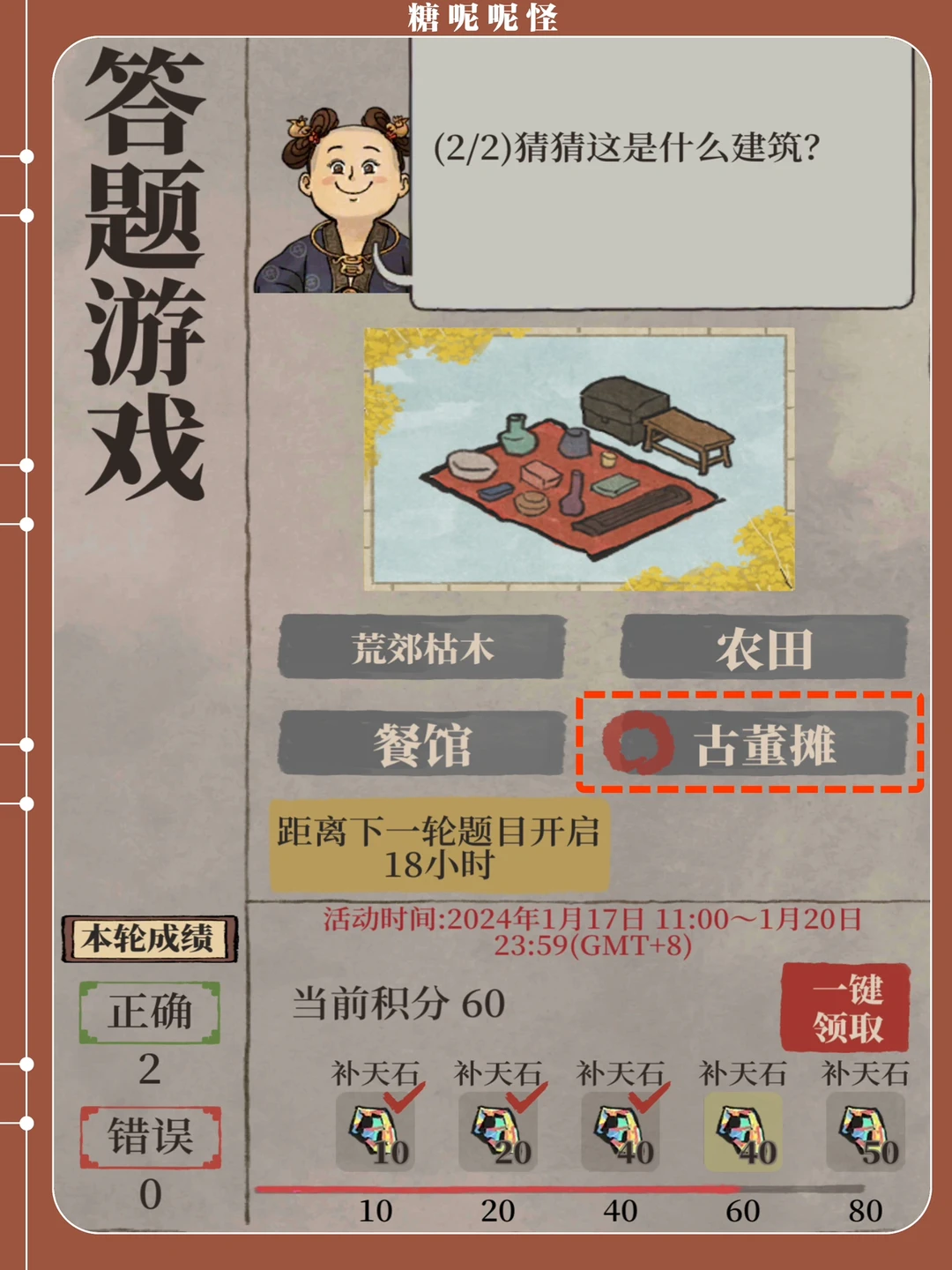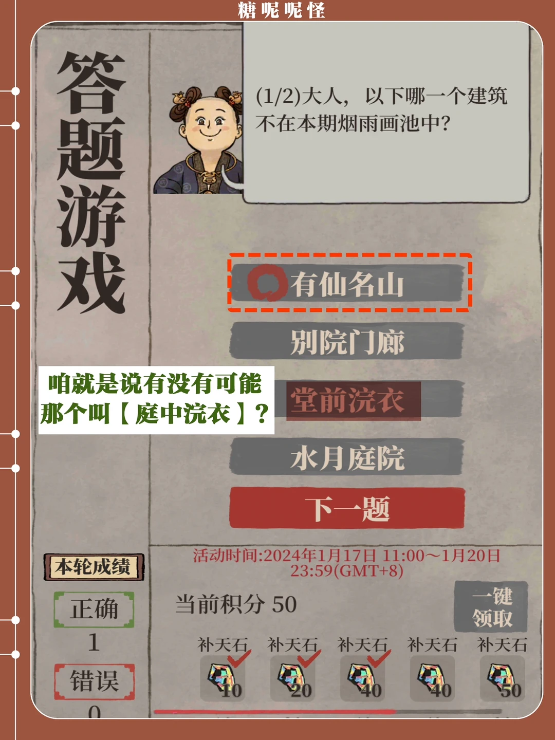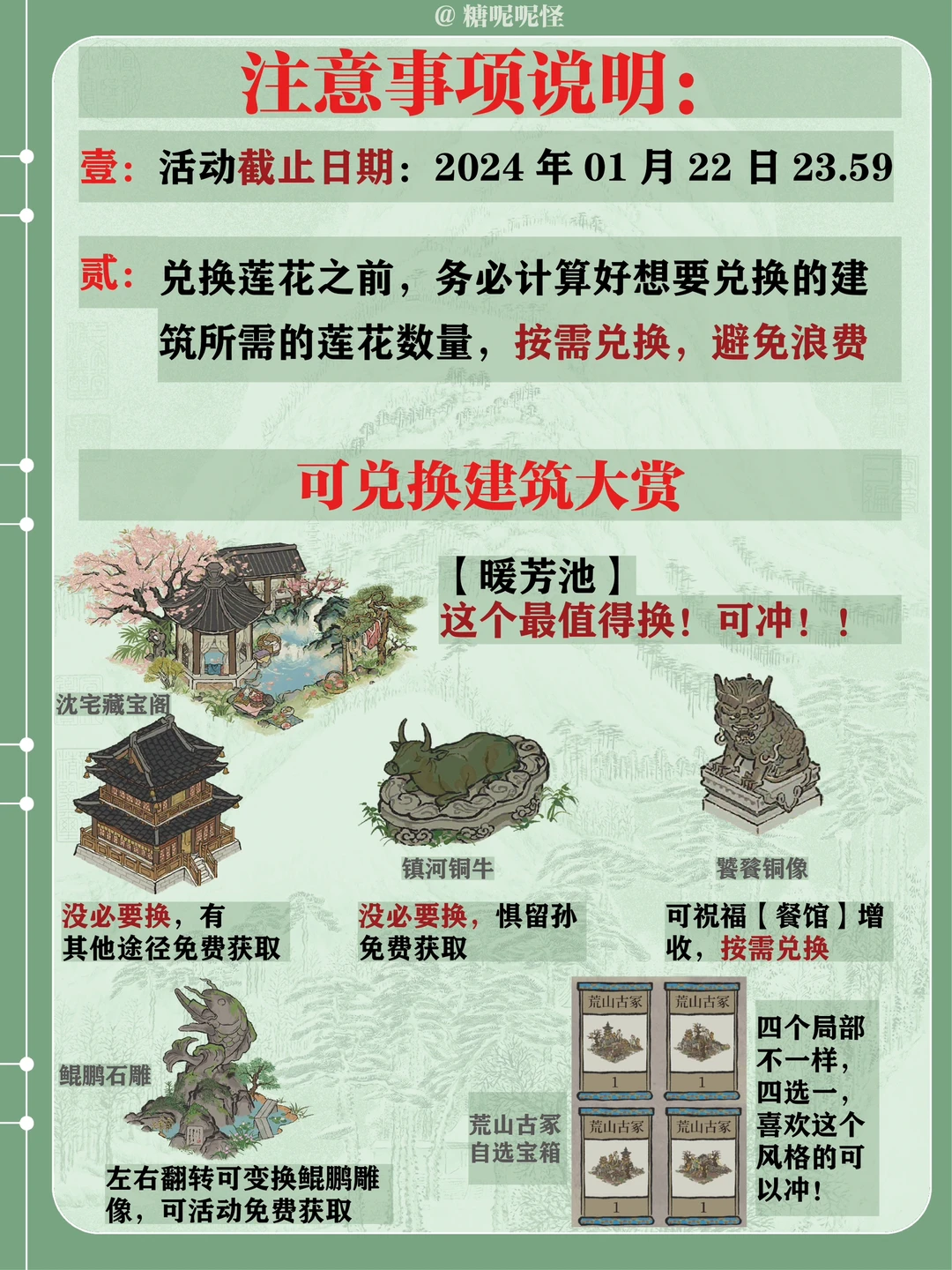 伴随画池活动开启的【建筑兑换】活动,截止时间是1月22日23:59 活动兑换界面后八个为【莲花】兑换,前八个为建筑,补天石以及画轴箱兑换 切记兑换莲花之前先计算拥有的【士级建筑】数量 个人认为只有暖芳池值得冲!!! 咱就是说今天的答题怎么回事,堂前浣衣是什么鬼[暗中观察R][暗中观察R][暗中观察R]