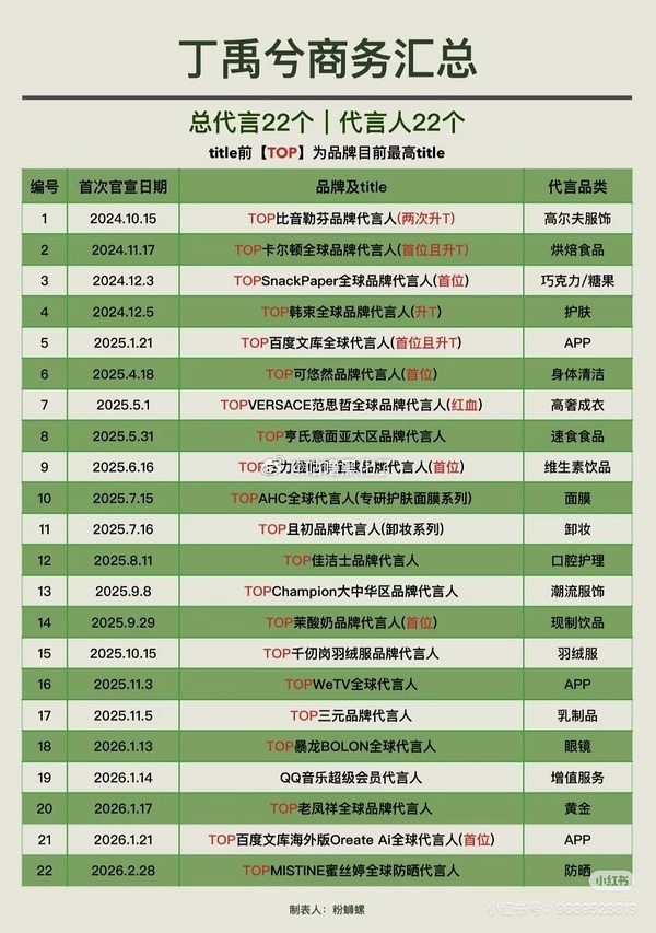 丁禹兮已经22个代言了!都是最高T,今年开年2个月新增了5个