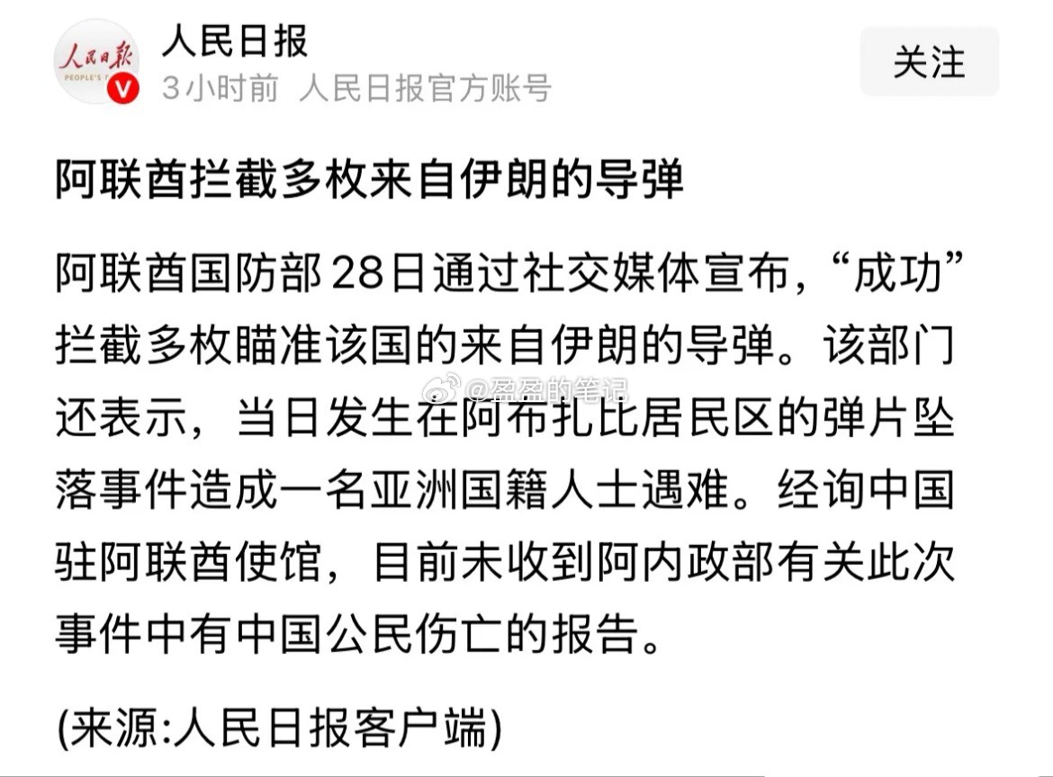 人民日报确认最新消息,伊朗导弹打死了亚洲人:过程,伊朗往阿联酋发射了导弹,但阿联酋拦截了多数导弹,其中碎片砸死了一个人,这人是亚洲人,但不是中国人。大概率是韩国或者日本人?毕竟他们股市大涨,有钱去阿联酋玩。幸好A股很稳定,股民没赚到什么钱,没那么多人去阿联酋玩。
