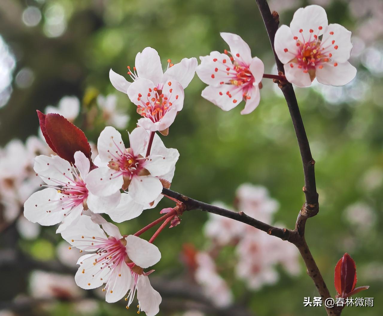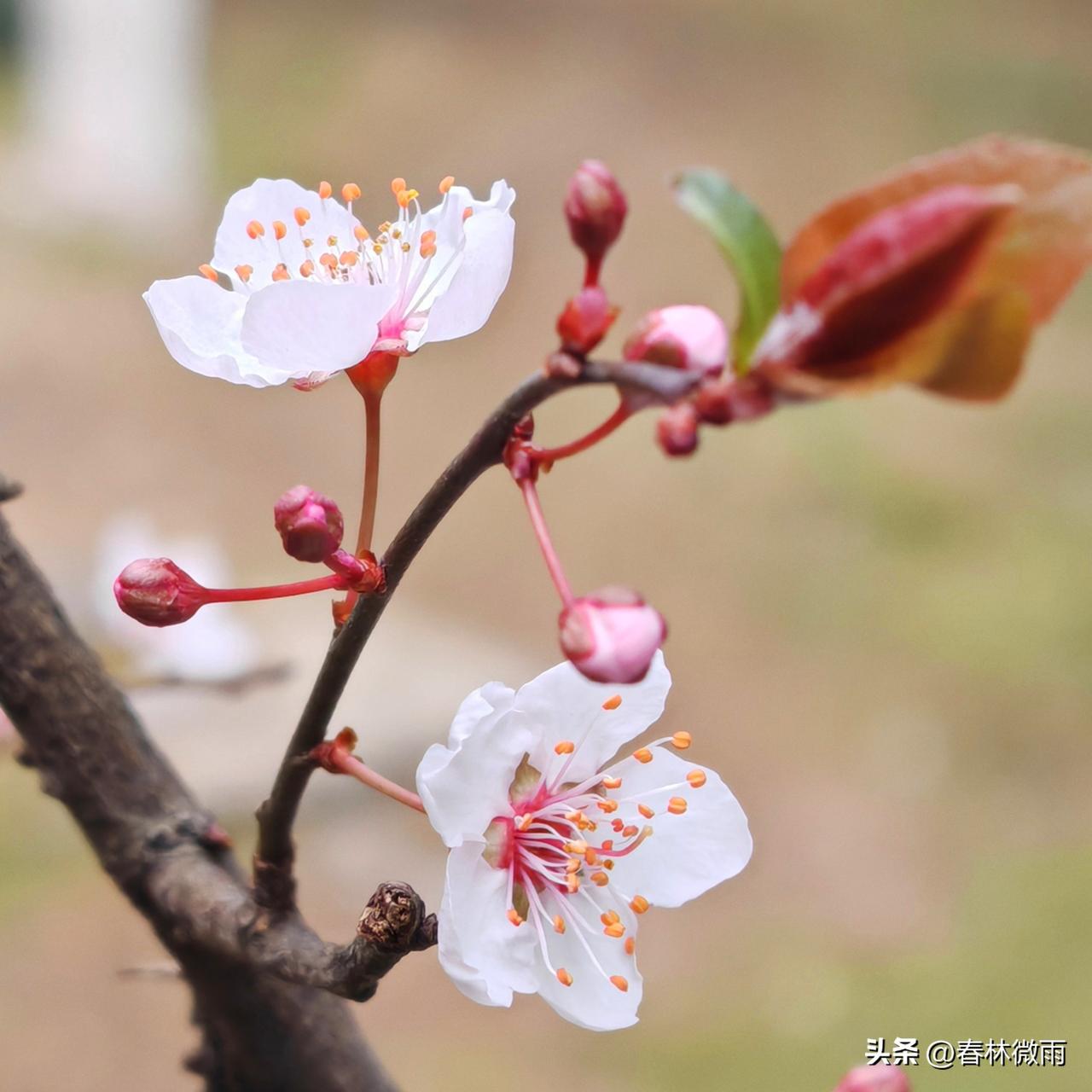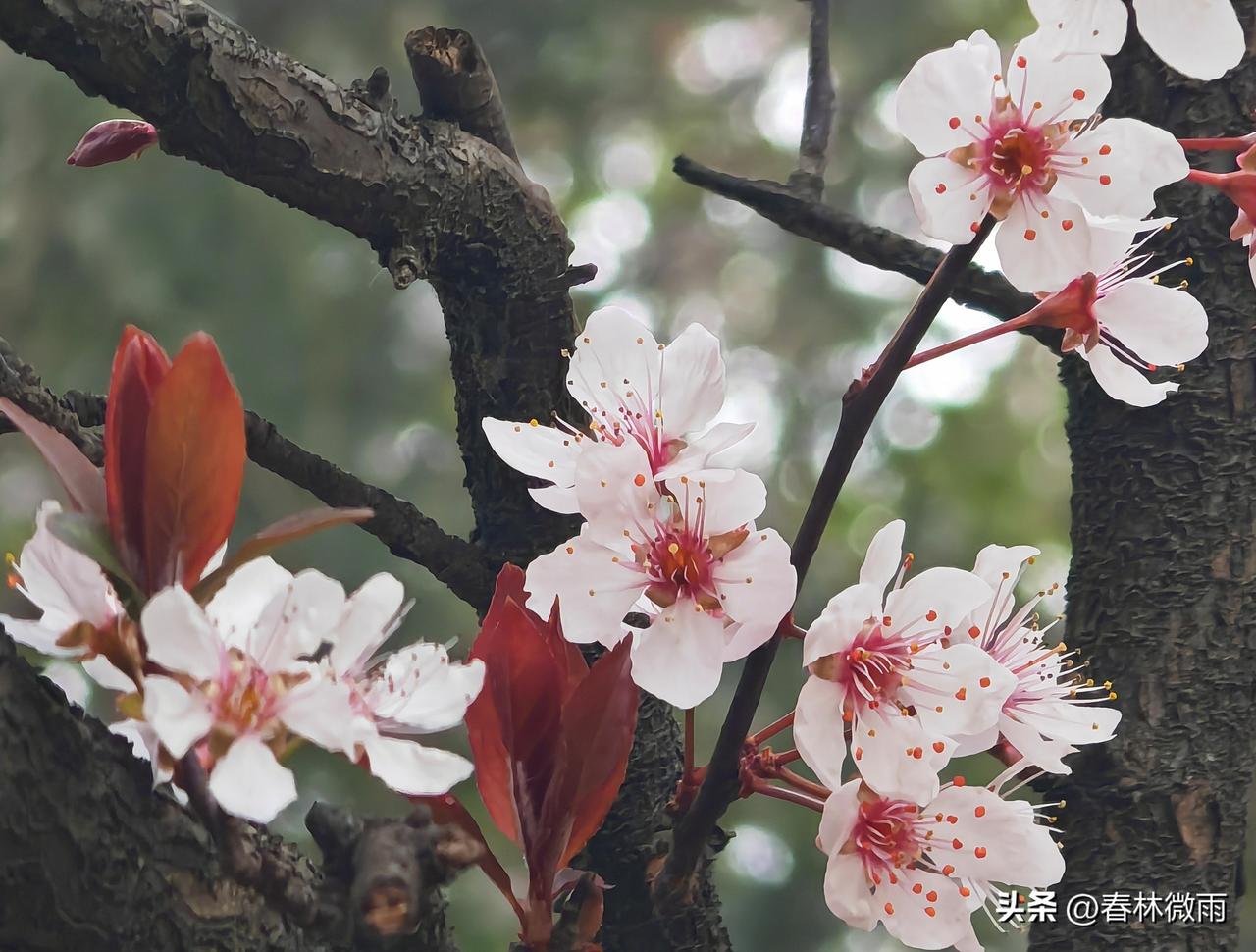 早春时节,天气渐暧。小区的紫叶李开花了。雪白的小花,红色的花蕊。层层叠叠,开满枝