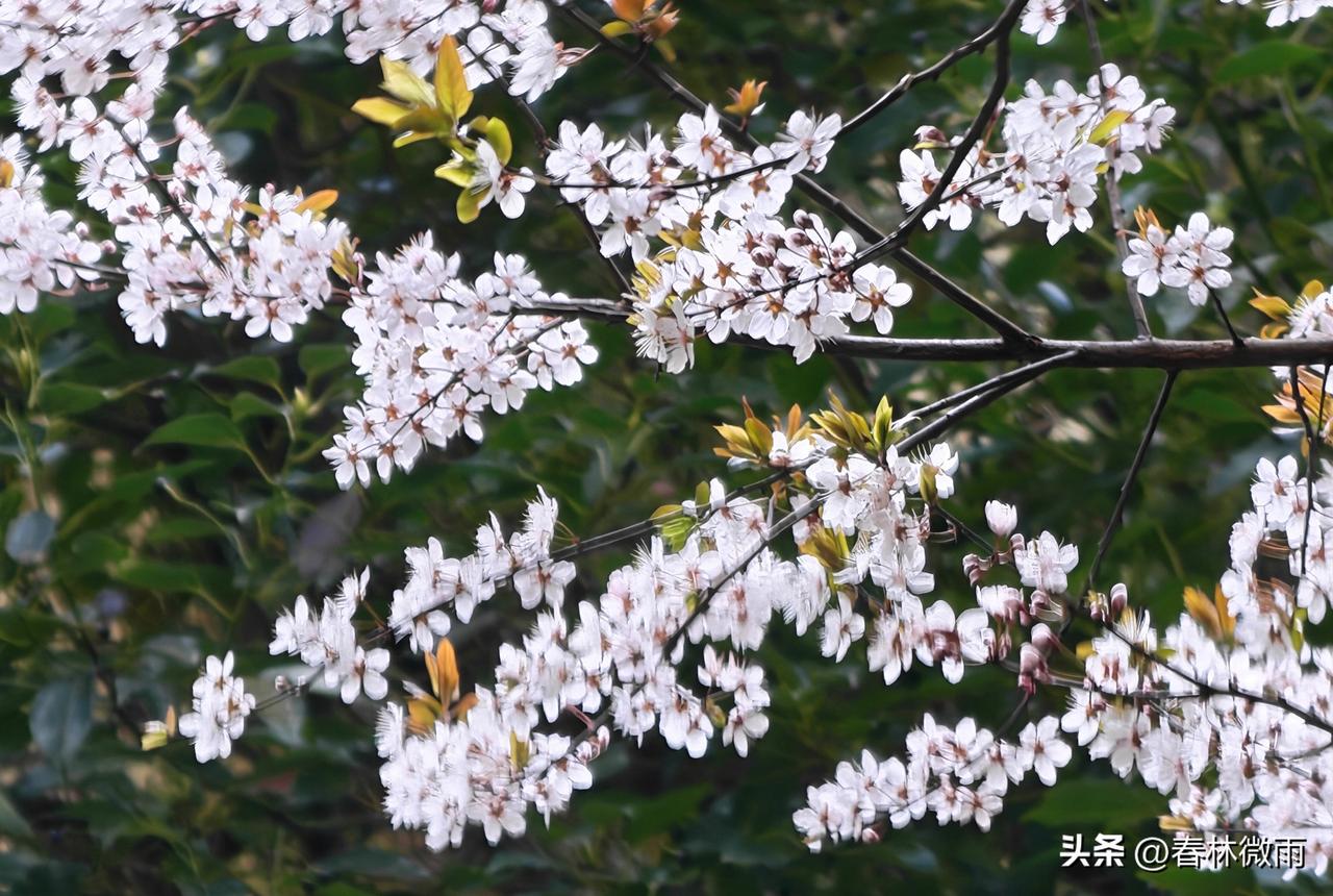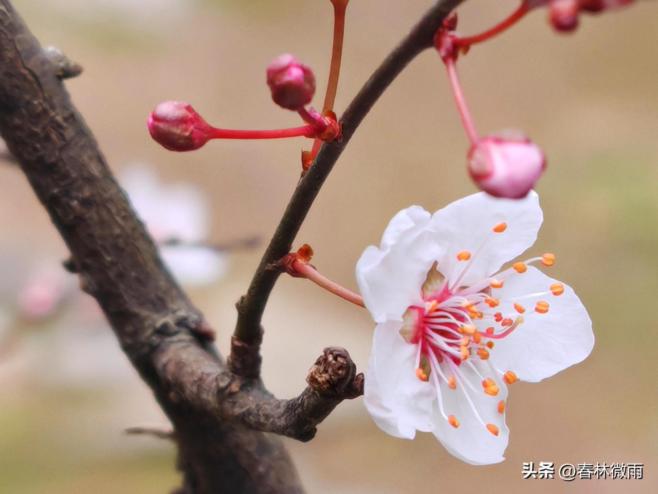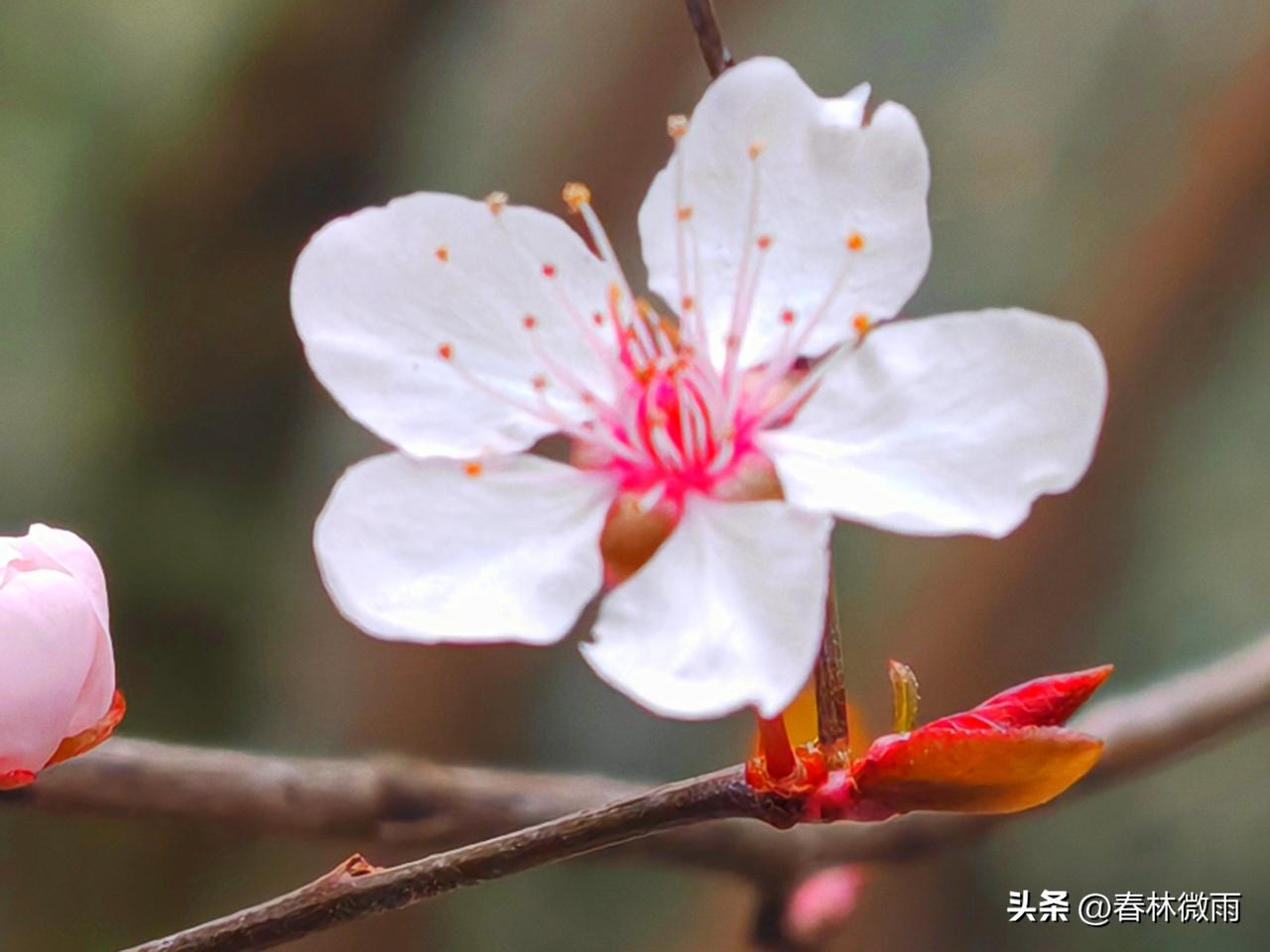 早春时节,天气渐暧。小区的紫叶李开花了。雪白的小花,红色的花蕊。层层叠叠,开满枝