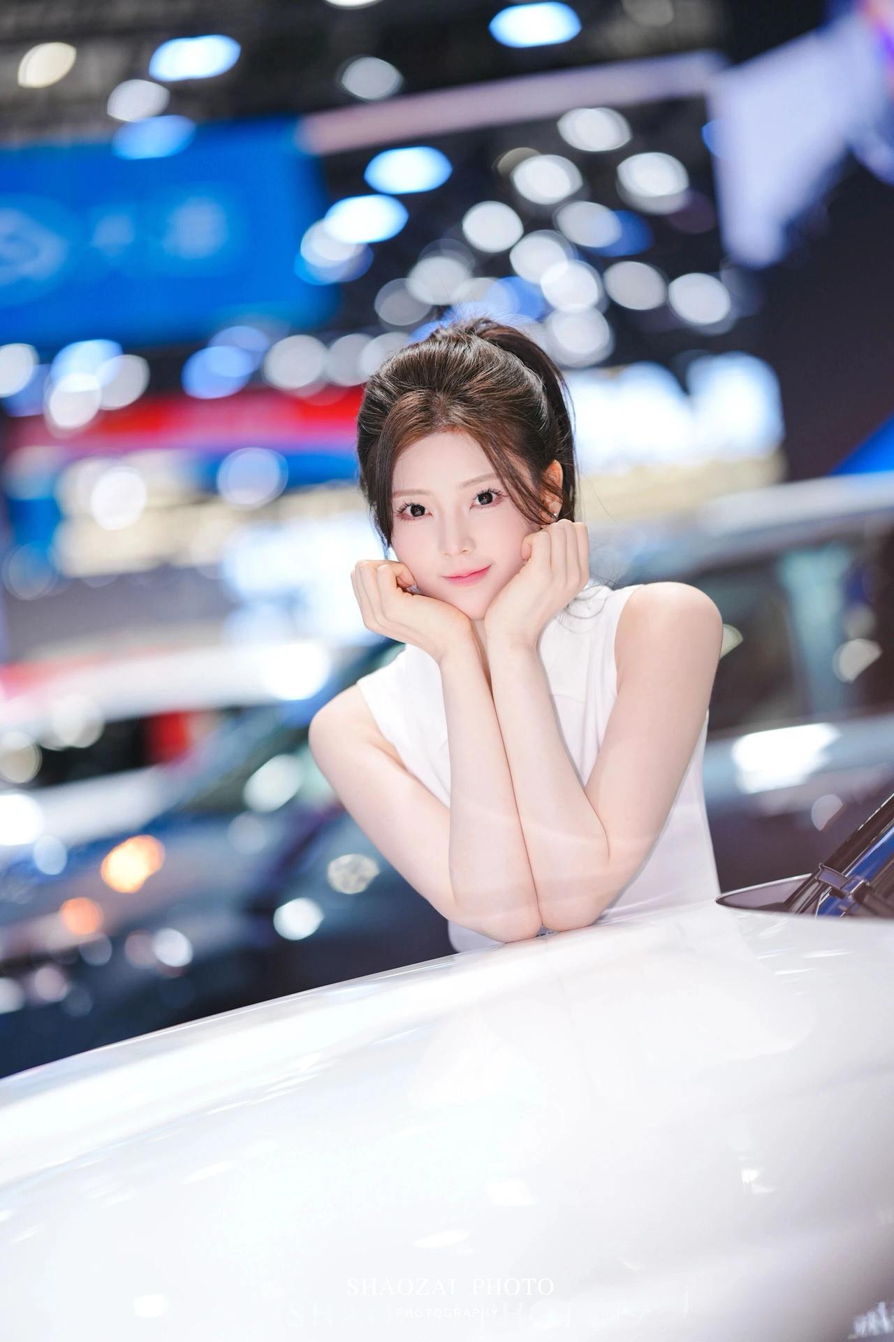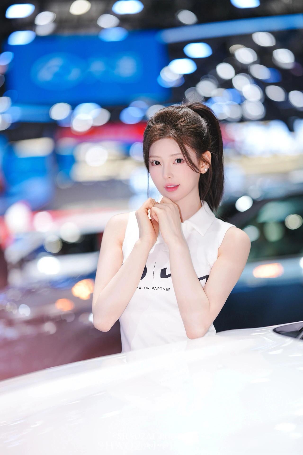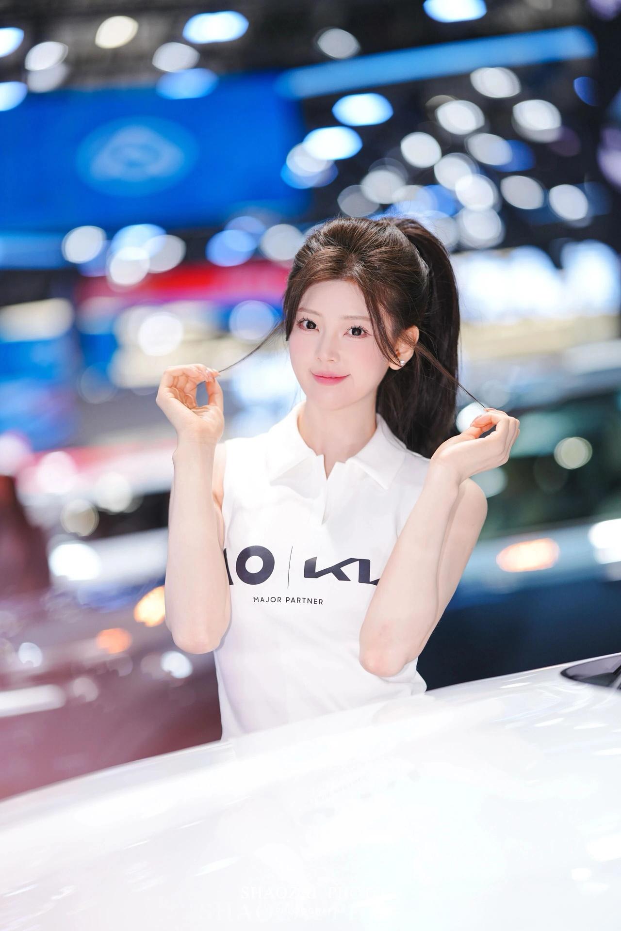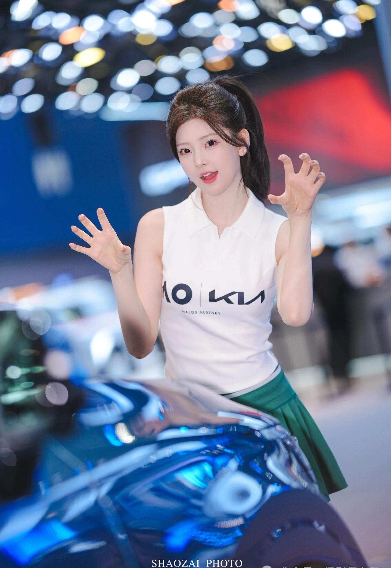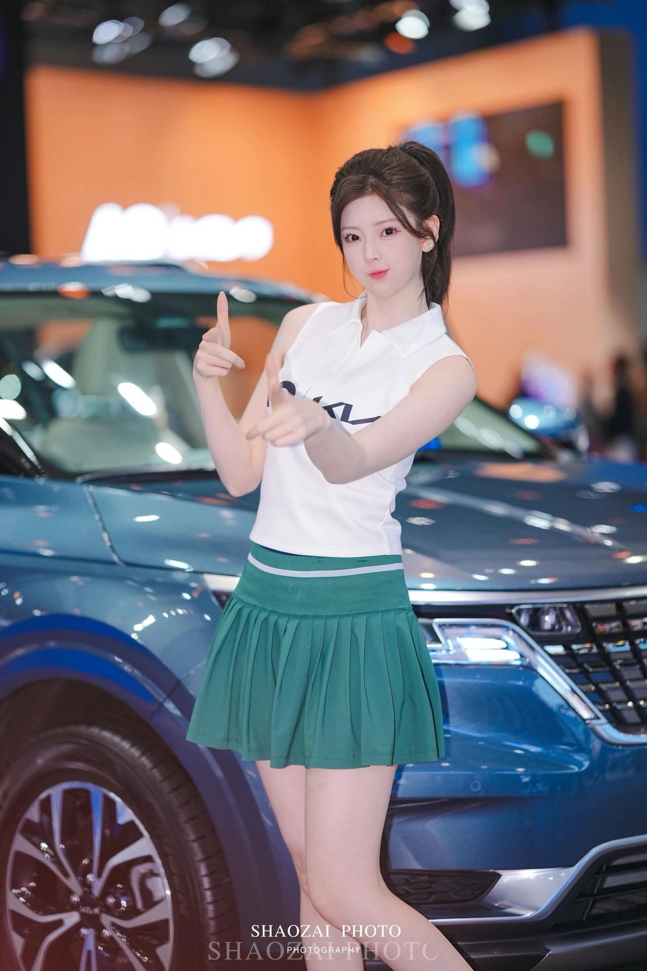 高马尾利落清爽,搭配简约无袖白上衣与绿色百褶短裙,青春感拉满。肌肤白皙透亮,五官精致甜美,眼神灵动温柔。 她在展台前变换多种可爱姿势,托腮软萌、比心俏皮、比耶元气、轻捻发丝温柔,每一帧都少女感十足。在璀璨灯光与靓车映衬下,清新甜美又元气满满,成为车展上超吸睛的一抹亮色。