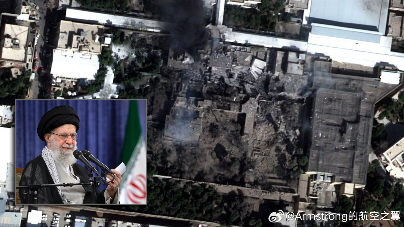 图为德黑兰遭受袭击的哈梅内伊官邸,据一些报道,哈梅内伊位于德黑兰的住所遭到多达 30 枚炸弹袭击,卫星照片显示多栋建筑物被毁。