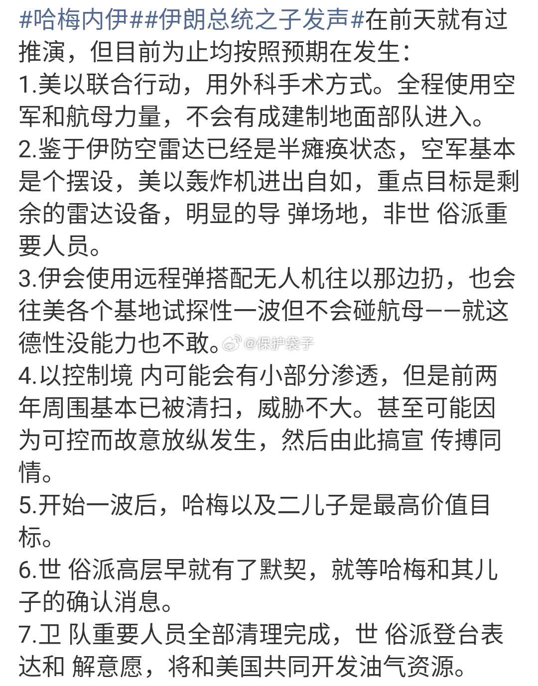哈梅内伊遇害哈梅内伊的女儿女婿等遇难果然还是按照推演在继续。那么作为现阶段最高价值目标之一的完成后,还有个二儿子现在在哪里呢?与其说哈梅作为一个象征意义上的人物女儿女婿陪同着照顾,以为别人有顾忌,不如说这些人自身对美以的决心估计不足。而目前伊朗还能做各种表态,还有力量在反击,说明哈梅两个一明一暗游走的两个儿子依然还是没有问题。特别是掌握了实际力量的那位,现在是美以唯一的高价值目标了。这个人最终的结局出来后,伊朗所有事情就会明朗。袋子时评 估计伊朗世 俗派早就迫不及待了。