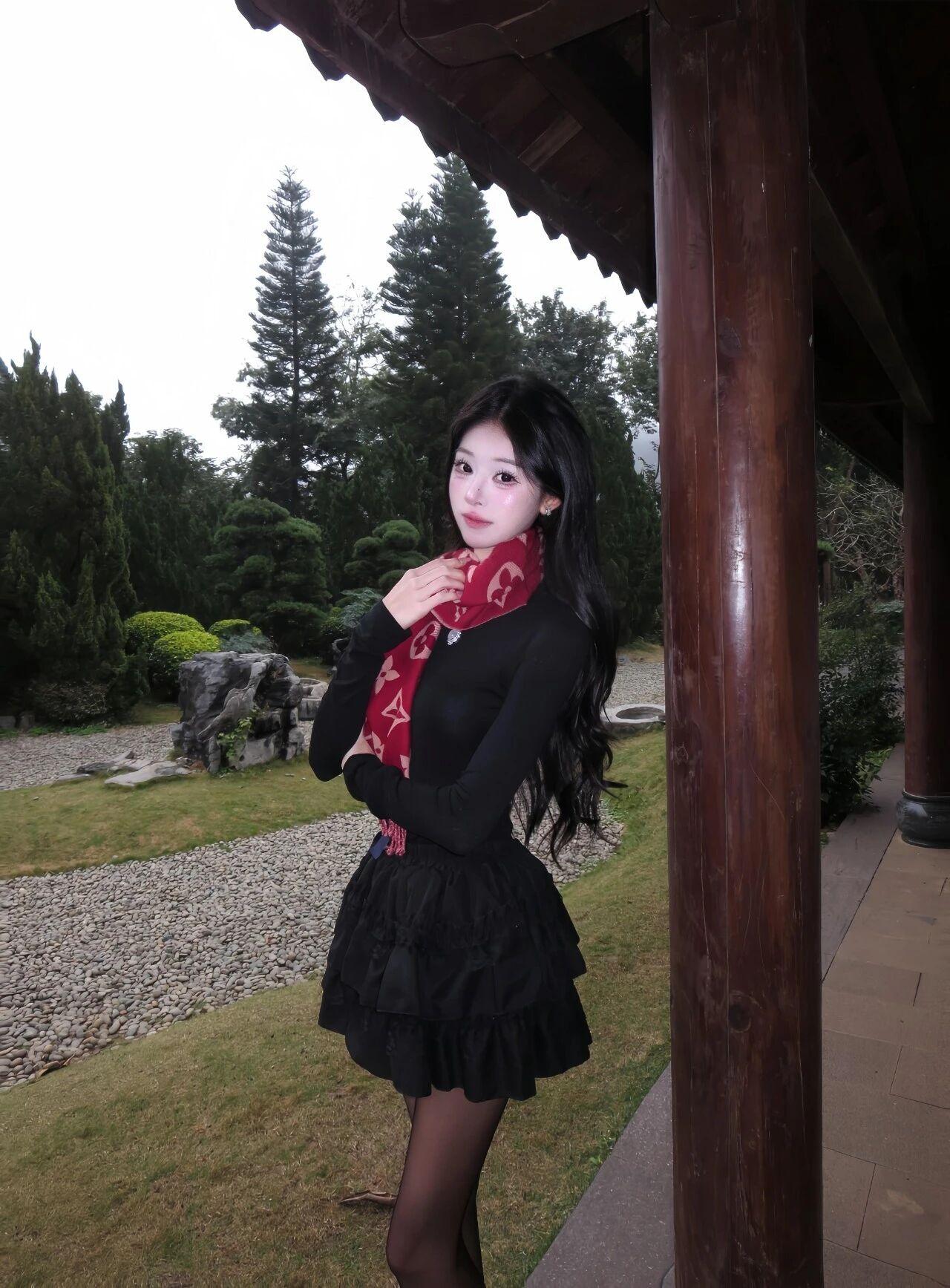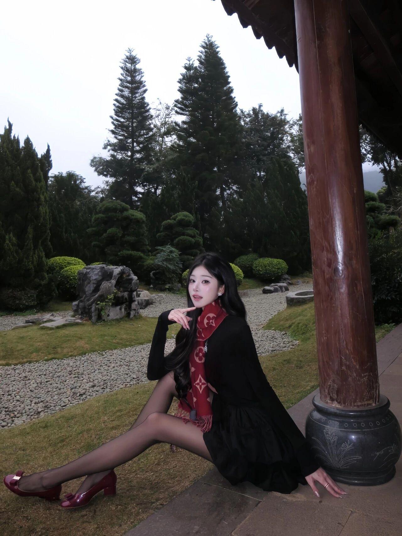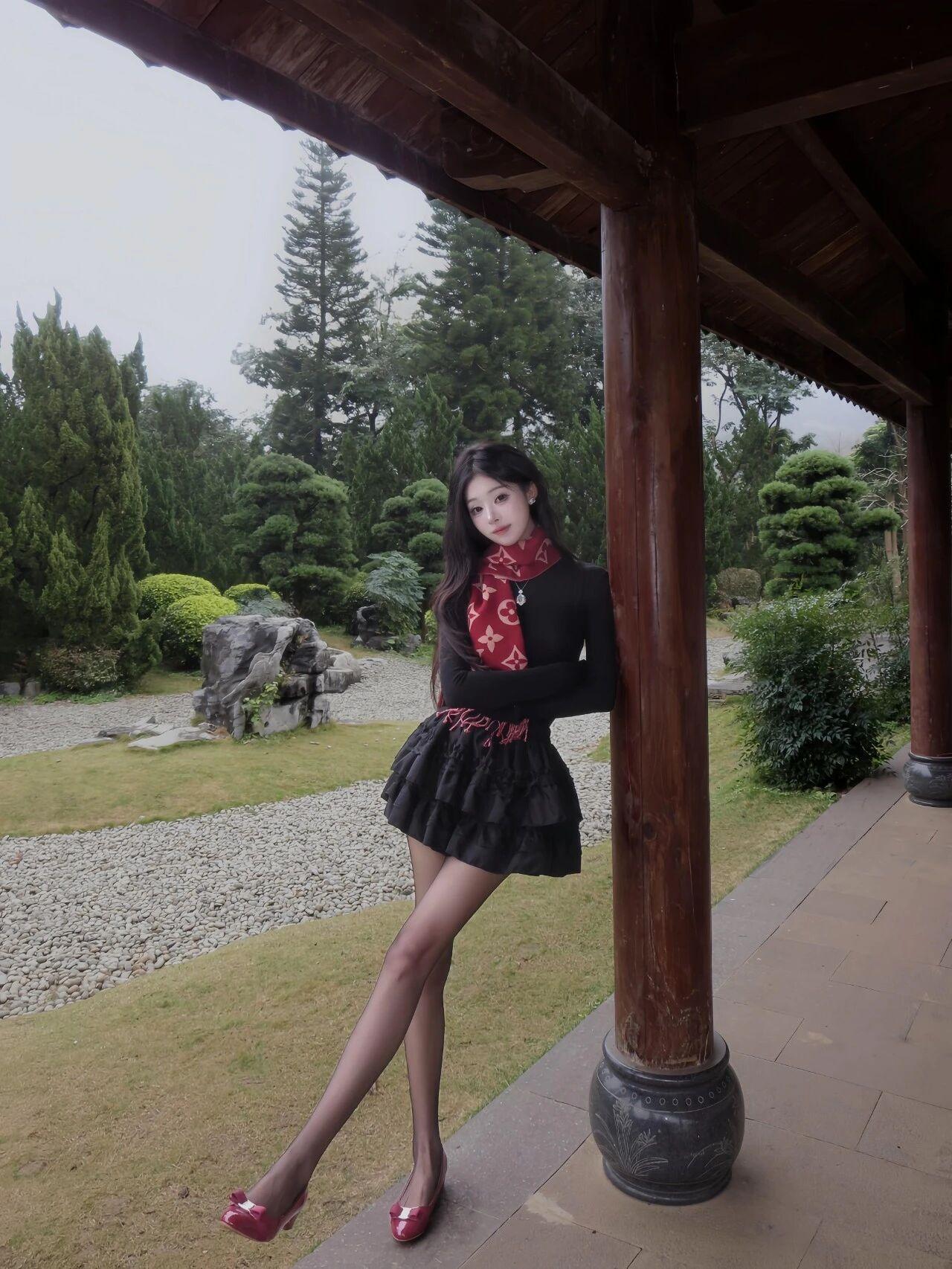 气质穿搭怎么穿才恰到好处?小姐姐美得好惊艳~乌黑长卷发温柔又妩媚,经典黑红穿搭气场拉满,红色围巾与红鞋点睛,衬得肌肤白皙。身姿高挑纤细,眉眼精致灵动,在中式园林里,一颦一笑都优雅又明艳,又美又有氛围感。