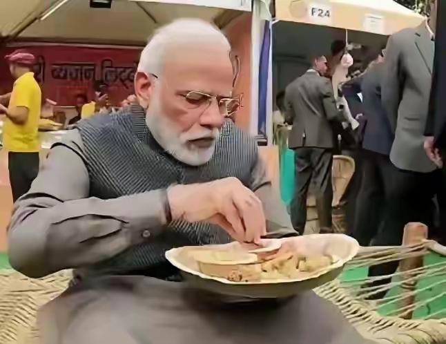 莫迪这个总理,用餐很印度呀,叶子装菜肴,用手抓食物。一方水土养一方人,再高贵的人都避免不了随俗。