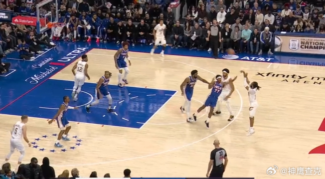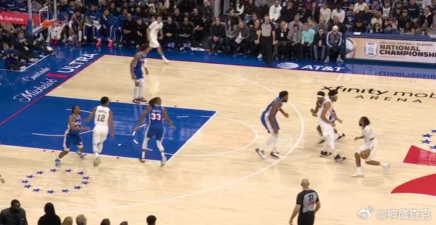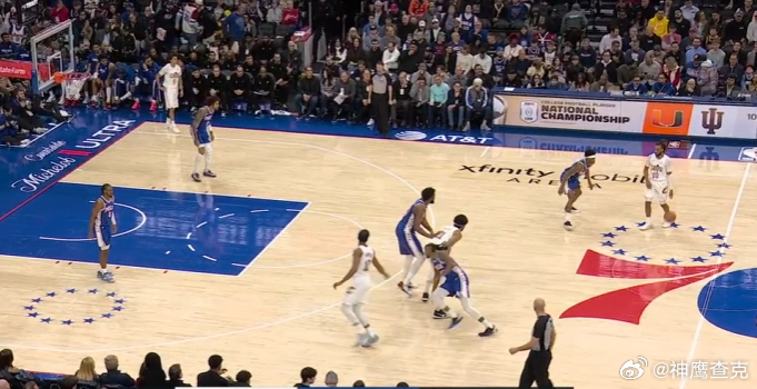 123456亨特无球执行“Flare Screen”起手,无缝衔接加兰和阿伦在LOGO位置发动的挡拆配合,挡拆行进间加兰见VJ走下线穿过+恩比德高位沉退,立即使用炸球垫步急停三分线外一步坚决出手持球三分,手起刀落打击防守。