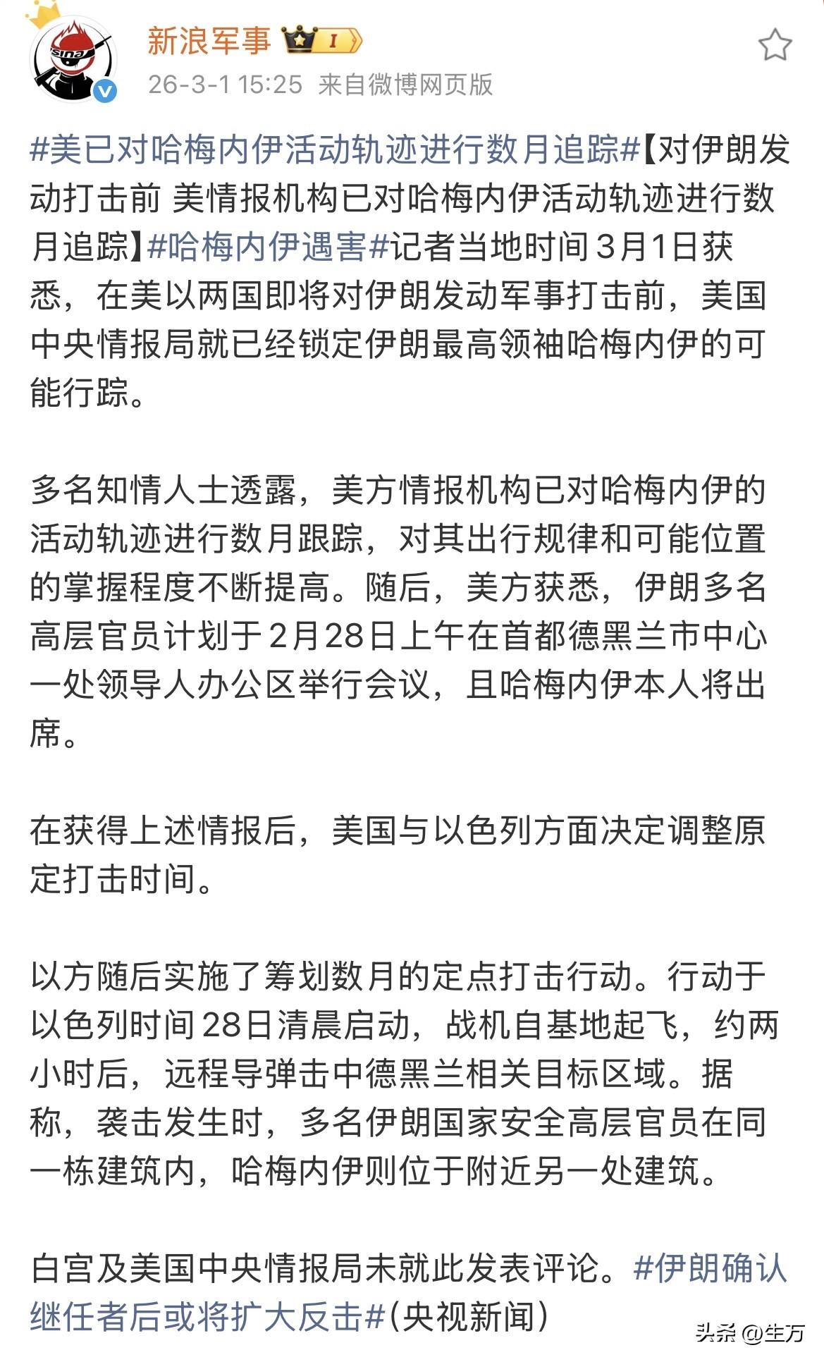 美情报机构:已对哈梅内伊活动轨迹进行数月追踪! 看了美军情报的这篇报道,说明我们现在看到的任何一个结果都是有备而来,而且是准备的非常充分。 随着哈梅内伊的离开,美方相应的情报机构把他们这几个月的工作成果展示出来,简单地说就是,这次之所以他们能够精准地实施斩首行动,并不是偶然,而是经过了超过一个多季度的严格情报测试与相关的行动。 这也再一次说明了特朗普手下的情报机构,并不像他本人一样喜欢夸夸其谈,仅仅是这几个月,他们就实施了两起斩首战术行动,一个是活活的把人抓走,一个是活虎人弄没,两种不同的结果,都需要前期做大量的工作。 而且如果没有记错的话,两天前美方才刚刚表扬了活捉马杜罗的行动人员,没想到他们另外一部人员就已经锁定第二个目标好几个月,也就是说只要他们下手,根本就不是这个时候才准备好,而是这两天时机刚刚好,他们随时都可以下手,这才是厉害的地方。