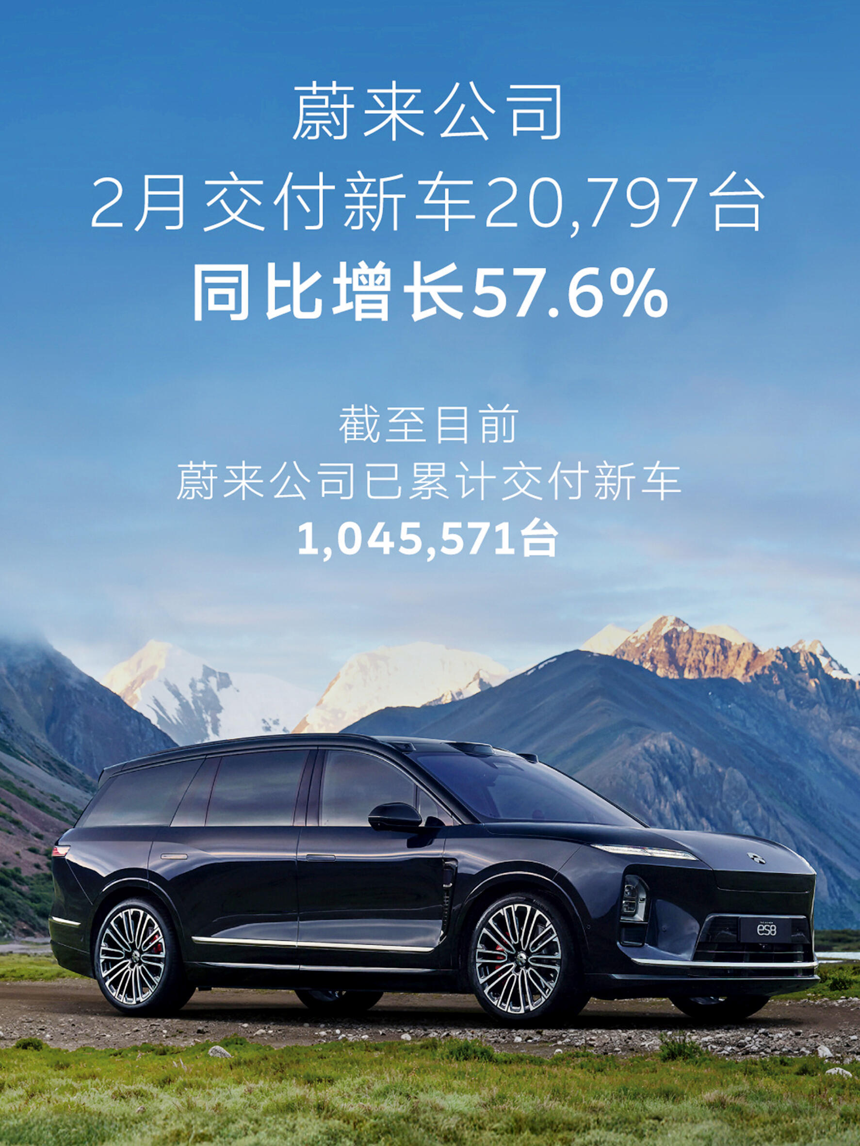 蔚来官宣:2月交付新车20797台,同比增长57.6%。蔚来公司累计交付新