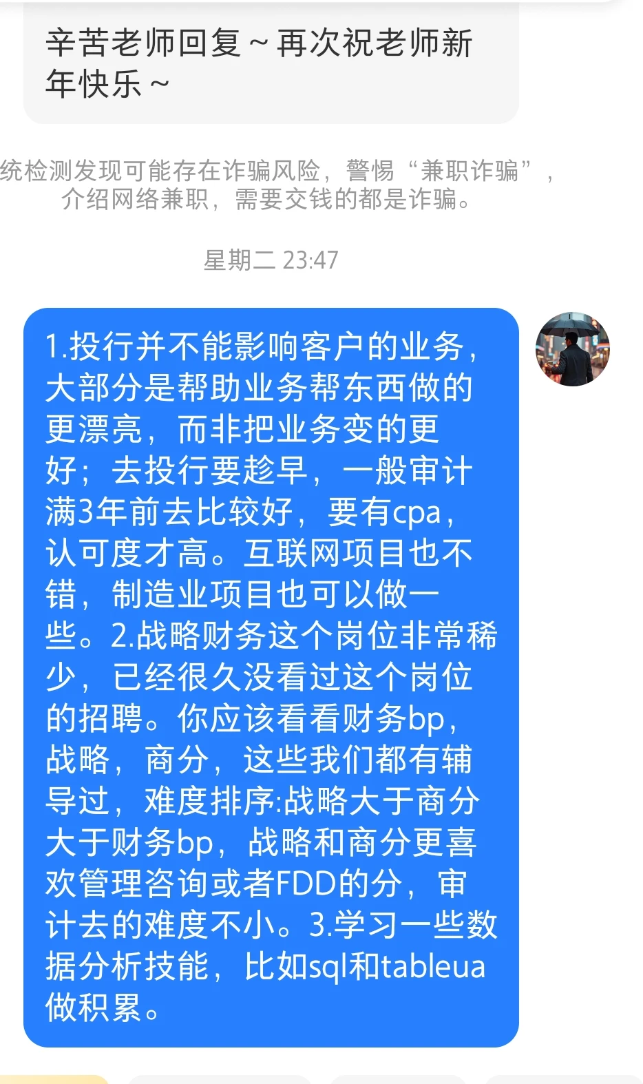 回复:1.投行并不能影响客户的业务,大部分是帮助业务帮东西做的更漂亮,而非把业务变的更好;去投行要趁早,一般审计满3年前去比较好,要有cpa,认可度才高。互联网项目也不错,制造业项目也可以做一些。2.战略财务这个岗位非常稀少,已经很久没看过这个岗位的招聘。你应该看看财务bp,战略,商分,这些我们都有辅导过,难度排序:战略大于商分大于财务bp,战略和商分更喜欢管理咨询或者FDD的分,审计去的难度不小。3.学习一些数据分析技能,比如sql和tableua做积累。