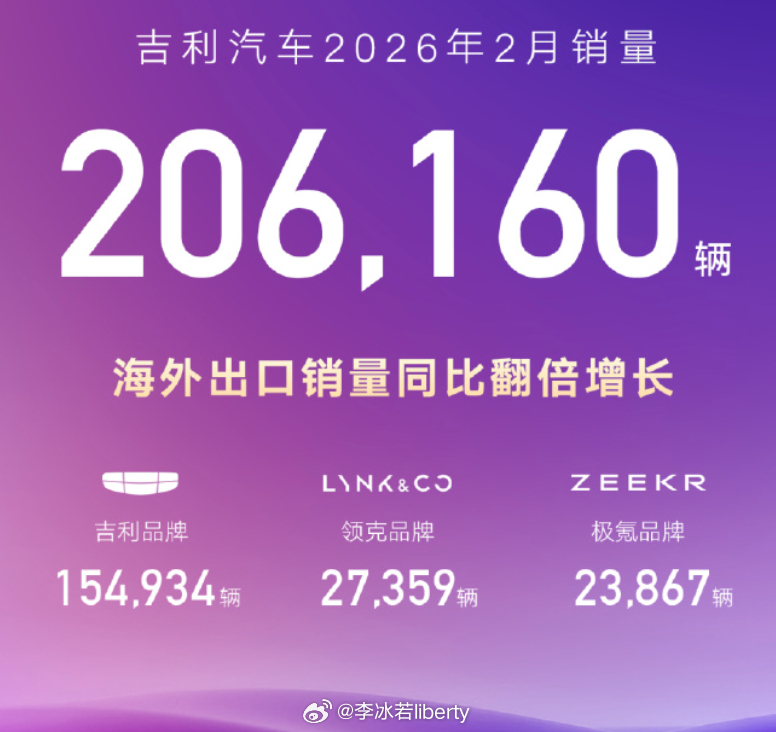 吉利汽车蝉联自主品牌销量冠军 有点猛啊年后看到吉利这波月销数据2月销量206,160辆新能源销量117,488辆(银河/领克/极氪品牌)各品牌具体数量看配图今年重磅新车还有不少,8x很近了下个月再看看!