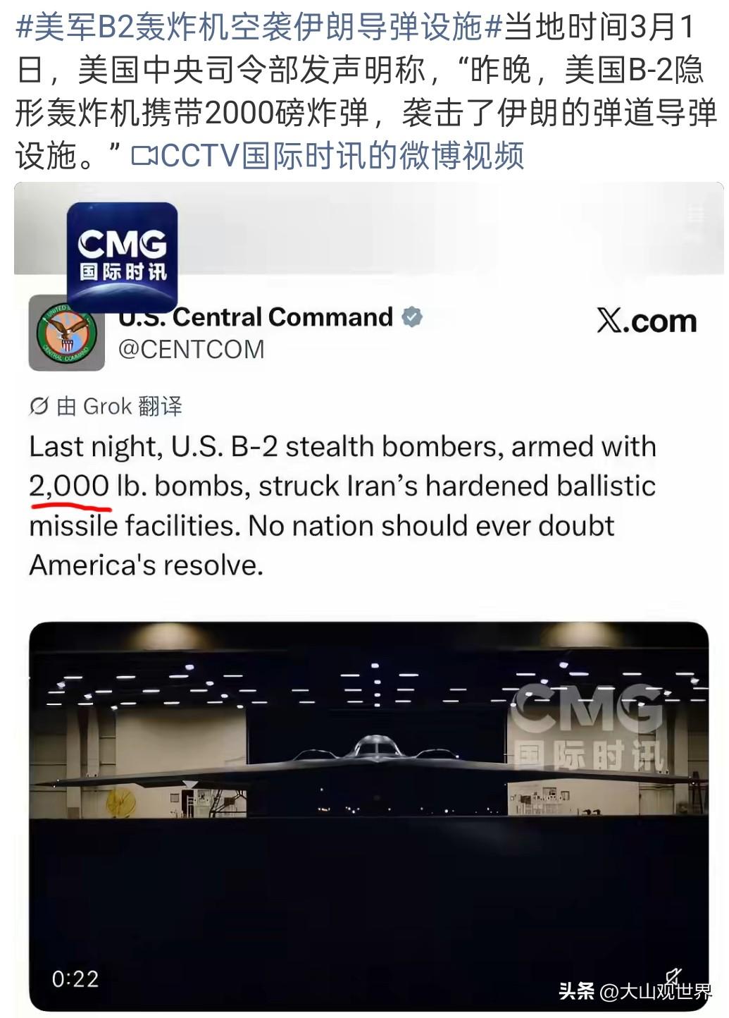 只炸导弹不碰核?美国这步棋,太阴了 当地时间3月1日,美军正式官宣:B-2隐形轰炸机真炸伊朗了! 不是演习,不是威慑,是实打实的跨洋实战打击。 多架B-2从美国本土起飞,长途奔袭伊朗境内多处弹道导弹基地、地下加固设施、指挥中枢,投下多枚2000磅重型精确制导炸弹,目标全部摧毁。 美国这波操作,克制得反常,算计得吓人: ✅ 真炸了,但只炸导弹,绝不碰核 怕把伊朗逼上绝路,怕引发全面战争,更怕国际舆论爆炸。 精准拿捏“可控升级”,打疼你,但不逼疯你。 ✅ 出动B-2,根本不是为了炸得狠 是为了炸得你看不见、拦不住、防不了。 全球顶级隐身战略轰炸机,就是告诉世界: 我能随时端掉你的战略底牌,你却连我从哪飞来都不知道。 ✅ 这不是战术轰炸,是战略示威 B-2是美国核打击力量的象征,这次拿来炸常规目标,等于直接亮底线: 谁敢动美军、动以色列,我就用最高级武力,废掉你所有远程反击能力。 美国在告诉全世界: 我依然拥有全球唯一的隐形战略打击能力,想打谁就打谁,规则我来定。 靠炸弹压不服一个国家,靠霸权镇不住一腔怒火。中东这颗火药桶,正在被一点点点燃。 国际 军事