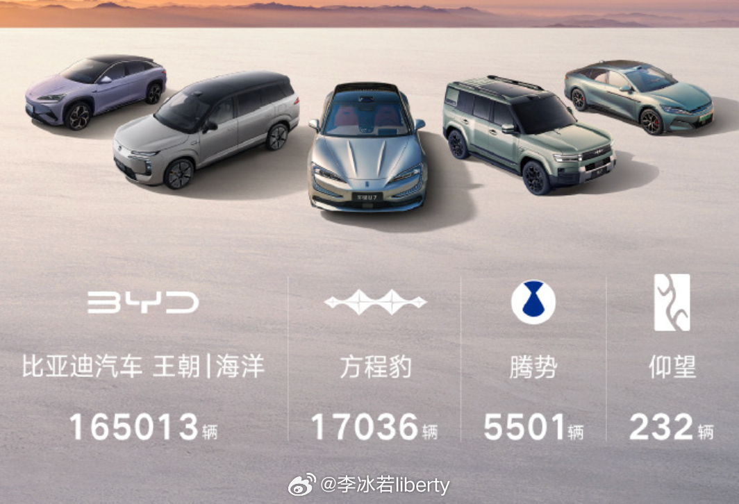 品牌销量王朝 | 海洋:165013 辆方程豹:17036 辆腾势:5501 辆仰望:232 辆新能源汽车