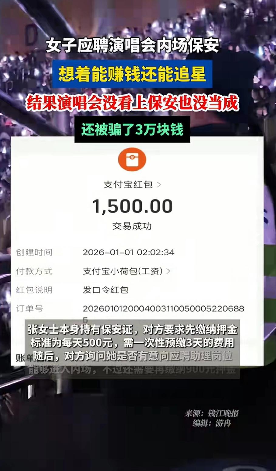 女子应聘演唱会内场保安,想着能赚钱还能追星,结果演唱会没看上保安也没当成还被骗了三万! 浙江嘉兴的张女士可太惨了。她在家刷到演唱会内场保安招聘广告,想着能赚钱又能追星,就联系了对方。 她有保安证,对方说上岗要先交每天 500 元的押金,得一次性预缴 3 天,她就转了 1500 元。 之后又被诱导应聘助理岗位,交了 900 元。去年 12 月 30 号她跑去郑州,对方还不断以能进后台拿签名之后对方又利用张女士想看多场次、多位明星的心理,编造出进场需缴纳保证金、要走流水等理由,还一直强调,这些钱都可以退还,等理由骗她交钱,就这样她前前后后转了近 3 万。 张女士被骗子的各种套路洗脑,原本想着做内场保安,既能赚钱又能近距离看演唱会,一举两得的美事,到头来竟是骗子设下的圈套。 令张女士万万没想到的是到了现场啥也没看到,也没能顺利成为演唱会的保安。随后她报了警,民警侦查后很快锁定了外地的犯罪嫌疑人李某。 李某,无业,据其交代,因手头拮据,在网上看到有人用此类手法实施诈骗后,便模仿作案。目前,李某已被采取刑事强制措施。 幸好警方行动迅速,顺藤摸瓜将犯罪嫌疑人抓获。 也提醒大家找工作是为了挣钱,凡是找各种理由让交钱的,一定要谨慎,别工作没找到,先被骗了钱财。 追星的宝子们可得擦亮眼睛,别像张女士一样被骗!