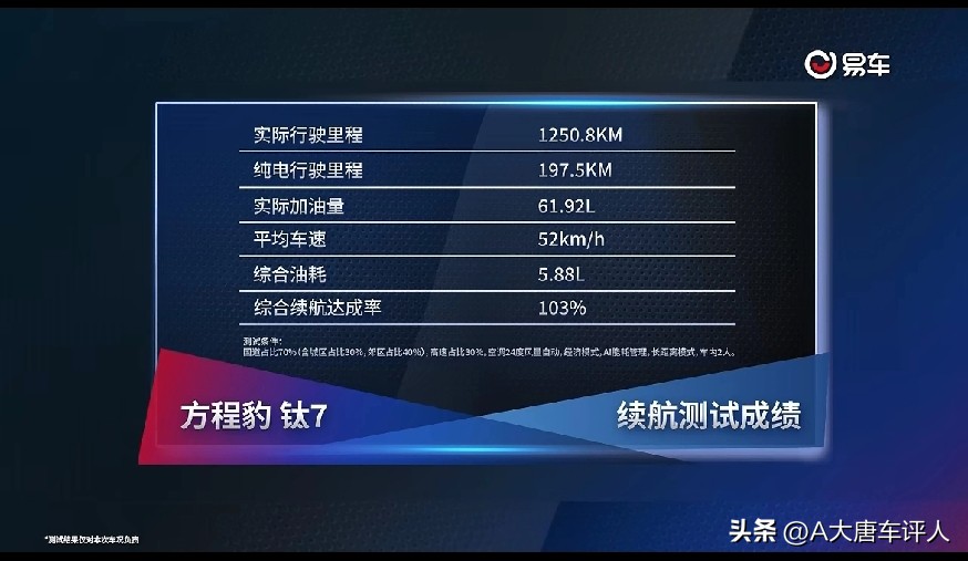 方程豹钛7实测续航! 续航测试1250公里,油耗5.88升/百公里。纯电实测197.5公里,达成率103%。 各位老表们怎么看