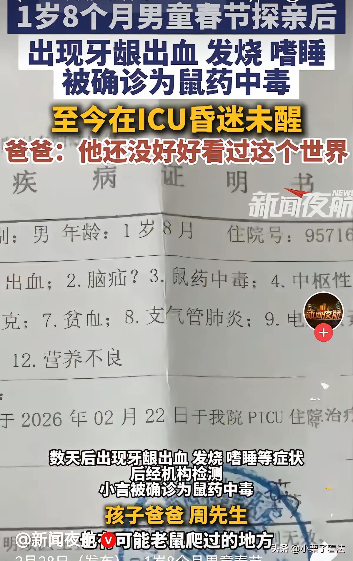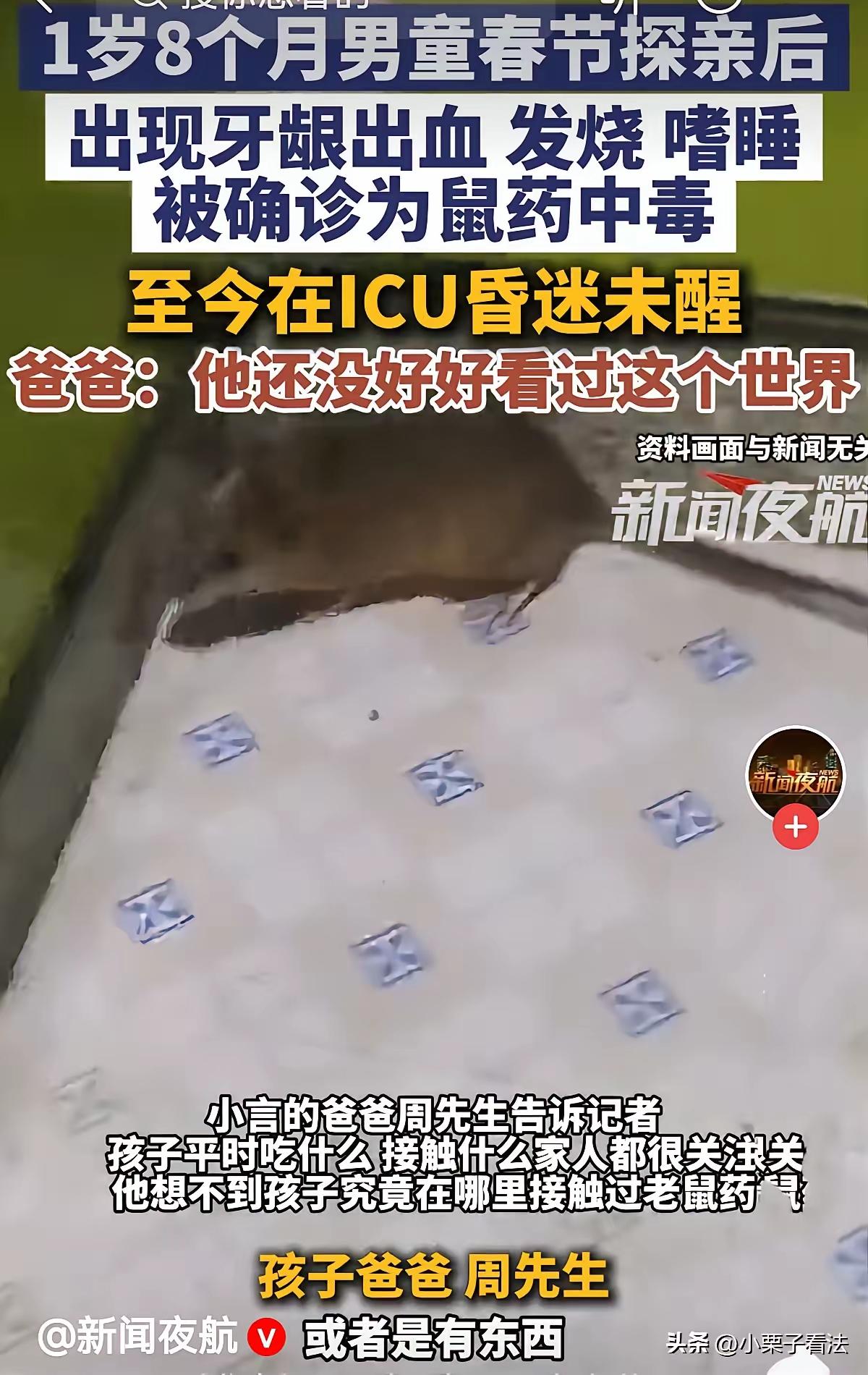 太蹊跷了!贵州毕节,夫妻俩带着1岁8个月的儿子去走亲戚,回来几天后,儿子就牙龈出血,发烧嗜睡,他们以为儿子感冒,给吃了点感冒药,可越发严重,赶紧去了医院。谁知被确诊鼠药中毒,直接进了ICU,靠呼吸机续命。巨大的治疗费压的他们喘不过气来。男子崩溃了:我儿子还没好好看过这个世界,不能眼睁睁看着他离开!哪怕有一丝希望也不放弃!网友:1岁多孩子,根本不能离开大人视线!没那么简单,报警吧! 这个刚满一岁八个月的孩子,正是刚学会稳当走路、最爱喊爸爸妈妈的年纪。一场普通的走亲戚,成了整个家庭的噩梦。孩子最初出现牙龈出血时,家人带着跑过诊所、看过口腔科,都被当成长牙磕碰、普通炎症处理。感冒药、止血药轮番用,症状暂时缓解,却藏着更致命的危险。没人会想到,这些看似平常的表现,竟是鼠药中毒发出的信号。 孩子血液中被检出高浓度溴鼠灵,这是市面上最常见的抗凝血类鼠药。它最危险的地方就是潜伏期长,误食后不会立刻发作,往往要等三到七天甚至更久才会显现症状。初期的发烧、嗜睡、轻微出血,和感冒、出牙不适高度相似,普通家长甚至基层医生,都很难第一时间联想到中毒。等到孩子意识模糊、无法自主呼吸,毒素已经在体内全面破坏凝血功能,颅内出血、脑疝等多种并发症接连出现,救治难度被拉到最大。 孩子被送进重症监护室,呼吸机维持着微弱的生命,每天的治疗费用超过万元。对普通家庭来说,这笔开支像一座大山,压得夫妻俩喘不过气。孩子还没见过山川湖海,还没好好认识这个世界,就要承受成人都难以扛住的病痛折磨。父亲那句不肯放弃的话,戳中了无数为人父母心底最软的地方。没人能接受,一个无辜的孩子,以这样莫名其妙的方式,站在生死边缘。 网友纷纷提醒报警,这样的建议绝非多余。一岁多的幼儿没有自主行为能力,不可能主动接触并误食鼠药。孩子在探亲期间去过多处场所,接触过不同环境,家人至今无法确定中毒源头。不查清毒物从何而来、如何接触,不仅没法给孩子一个交代,更可能留下持续的安全隐患。尽快报警排查,既是为孩子寻求真相,也是阻断潜在危险、保护更多孩子的必要举措。 五岁以下儿童是意外中毒的最高发人群,这个阶段的孩子好奇心强,抓到任何东西都习惯放进嘴里。家庭、亲戚家、公共场所的鼠药、杀虫剂、药品、清洁剂,只要放在孩子能触及的位置,就是随时会引爆的隐患。不少家庭觉得灭鼠刚需,却忽略了收纳防护,彩色的鼠饵在孩子眼里,和零食、糖果没有区别。 这样的悲剧也在给所有家长敲响警钟。孩子出现不明原因的出血、持续嗜睡、异常发烧,绝不能简单当成感冒处理。及时送往有检测和救治能力的医院,主动告知孩子近期去过的场所、接触过的物品,能帮医生快速锁定病因,抓住黄金救治时间。日常看护里,视线不离开低龄孩子,高危物品上锁密封,从来都不是多余的谨慎,而是守护生命的基本底线。 一条小生命还在ICU里顽强抗争,一个家庭在绝望中坚守希望。我们期待孩子能挺过难关,期待真相早日水落石出,更期待每一位家长都能把安全防护刻在心里,不让类似的悲剧再有机会发生。 各位读者你们怎么看?欢迎在评论区讨论。