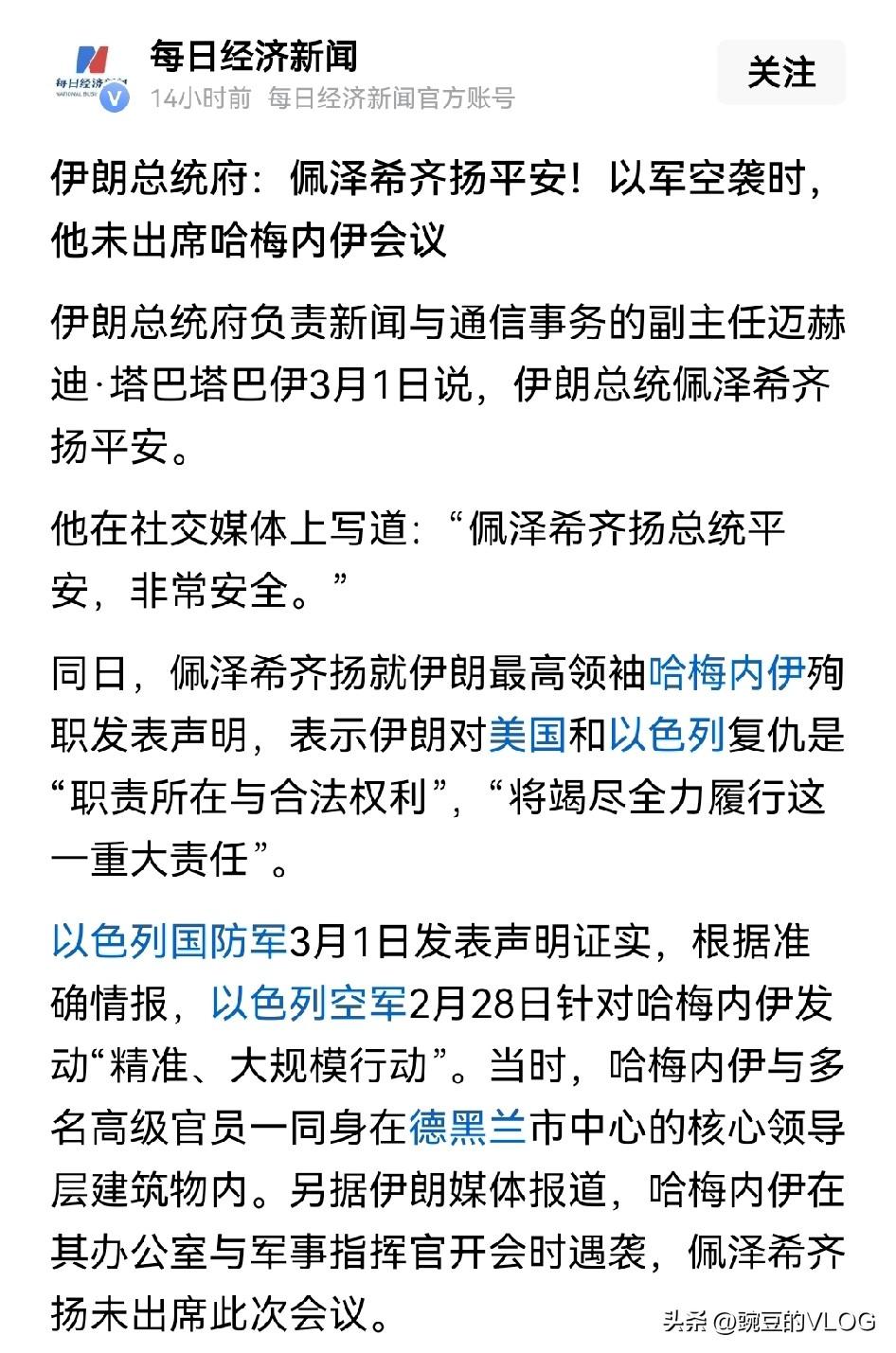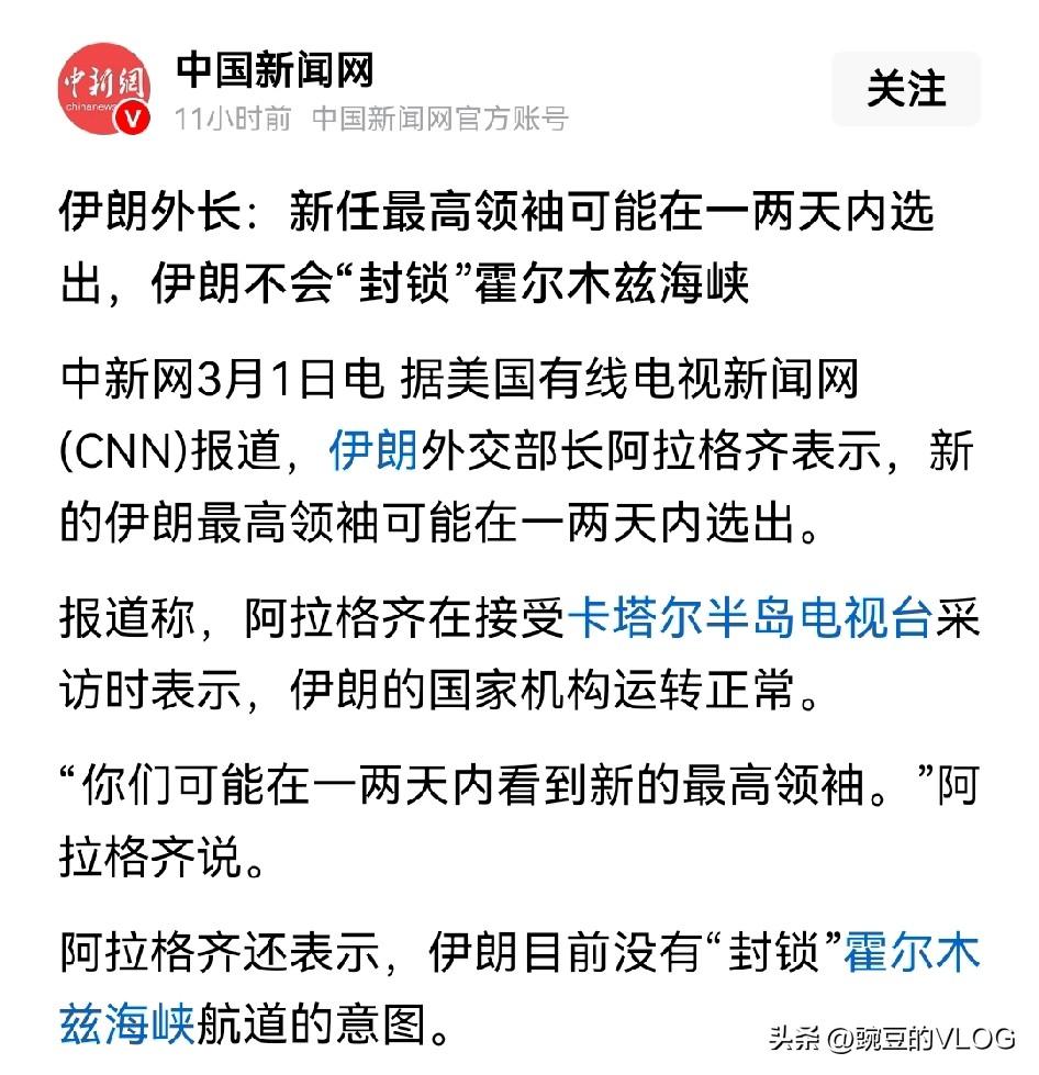 伊朗外长:不会封锁霍尔木兹海峡。 伊朗军力要比巴勒斯坦强的多。以色列几十年也没解决巴勒斯坦强硬派的不断反击,同样伊朗这块硬骨头美国和以色列短时间内也拿不下来。所以,就像伊朗外长所说,伊朗不会封锁霍尔木兹海峡影响国际能源运输通道,美以也会打一打然后见好就收,现在的问题是伊朗接下来会如何转变。如果有人坚持神权至上选择抵抗且支持率不低,有人选择与美以谈判走世俗化道路那伊朗的分裂和内耗将不可避免… 朋友们,你们对此事怎么看? 欢迎大家在评论区探讨,留言…[送心]