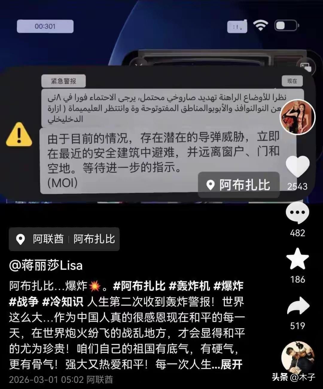 受中东局势影响,陈浩民全家滞留阿联酋,妻子蒋丽莎凌晨发的一句话,没卖惨没抱怨,却比所有惊魂细节都更戳人,太真实了。 这事就发生在2月28日,美以对伊朗的军事打击引发中东局势剧烈动荡,阿联酋阿布扎比传出爆炸声,官方紧急推送导弹威胁预警,要求民众立刻躲进安全建筑,同时关闭部分领空,机场航班大面积停飞、取消。 陈浩民和蒋丽莎一家,正好因为工作和度假待在当地,直接撞上这场突发危机,彻底滞留在了阿联酋。 惊魂未定的凌晨,蒋丽莎晒出了官方的紧急预警截图,全程没哭诉害怕,没抱怨行程泡汤,只发了短短一句话。 就是这句没任何修饰的真心话,瞬间戳中了无数中国人。 她写的是: “作为中国人,真的很感恩现在和平的每一天”。 别觉得明星有钱有资源,在这种事上就能有特权。真到了局势动荡的关头,他们和普通游客没两样——航班说停就停,改签无门,只能缩在屋里护着老人孩子,一遍遍刷着航班动态,唯一的心愿就是平安回家。 我们总觉得战争、动荡离自己很远,把和平当成理所当然。可你每天能踏踏实实睡觉、安安稳稳和家人吃饭的日常,恰恰是很多地方的人,拼尽全力都求不来的奢望。 目前当地航班正在逐步恢复,希望所有被困中东的中国同胞,包括陈浩民一家,都能平平安安,早点顺利回国。 你有没有过哪一刻,突然真切感受到,生在和平的国家有多幸运?评论区聊聊。