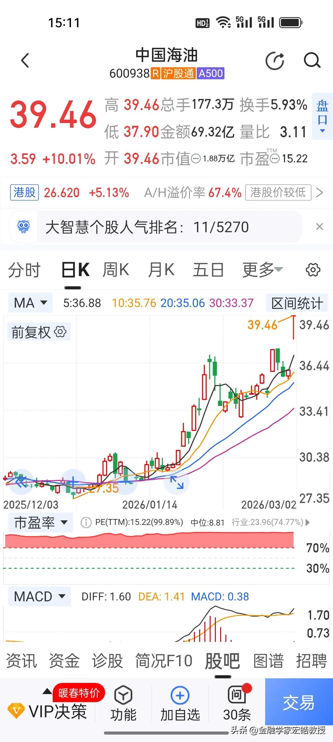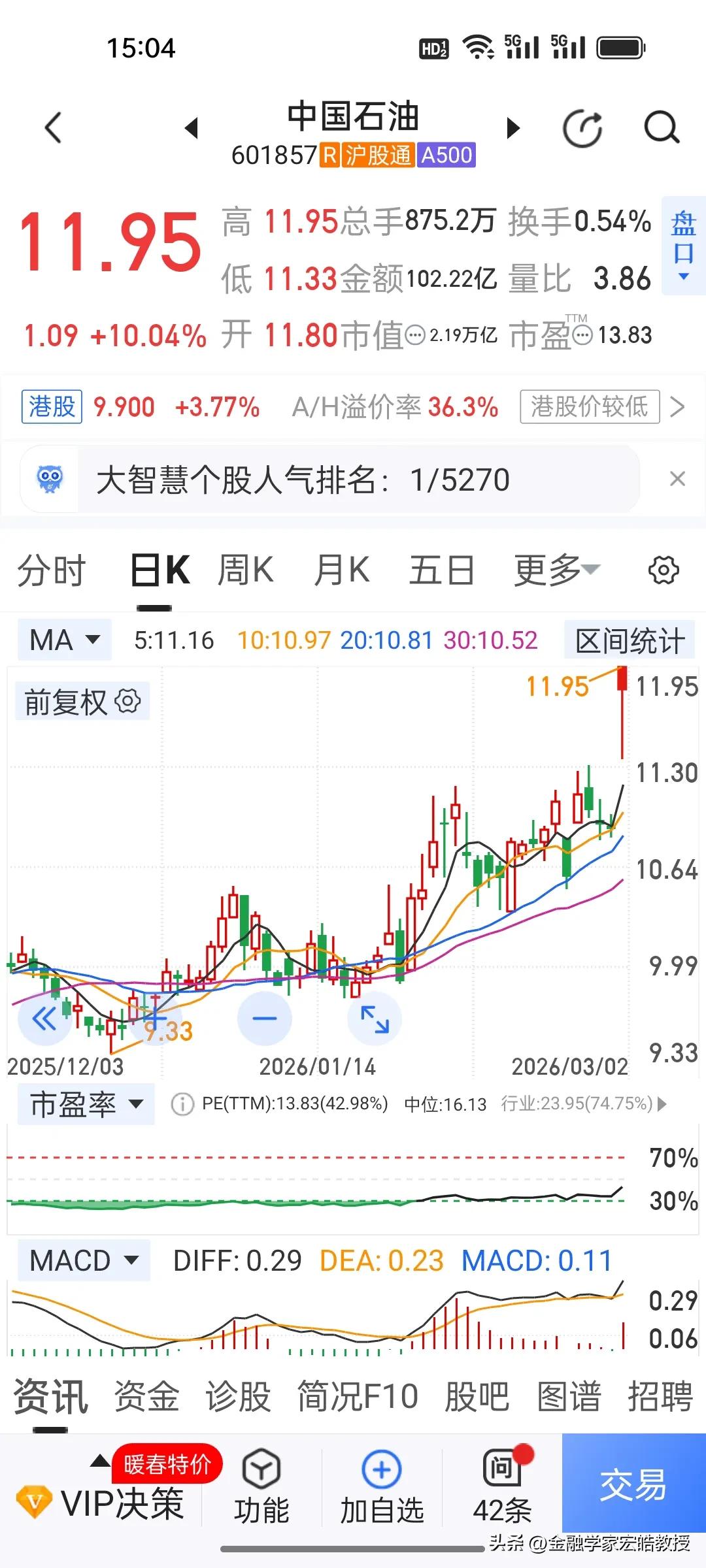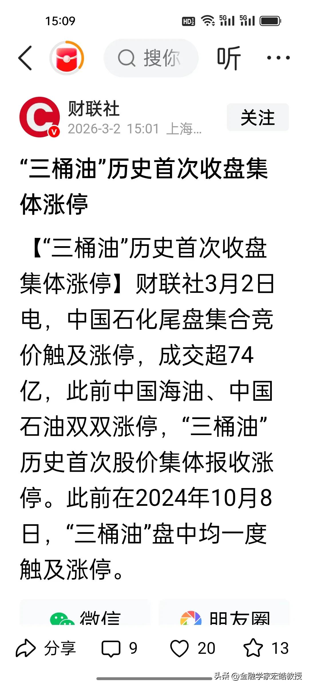 历史首次!三桶油尾盘集体涨停,硬核护盘!A股三月“开门红”彰显超强韧性!昨天李大霄的视频又过于悲观了。 中东局势动荡来袭,港股、日股集体走弱,令人没想到的是,大A却上演逆风局!石油三雄彻底爆发,中国石油、中国石化中国海油全部封板,石化系板块全线飘红,银行权重同步接力护盘,硬生生扛住外围冲击,上证指数稳稳收红,拿下三月“开门红”! 虽然科技板块今日承压,但这只是短期节奏切换。硬科技作为长期核心主线,业绩与政策支撑从未动摇,回调正是布局良机。A股这份临危不乱的韧性,早已是常态,“两会”将至,继续坚定看好后市“慢牛”的机会!