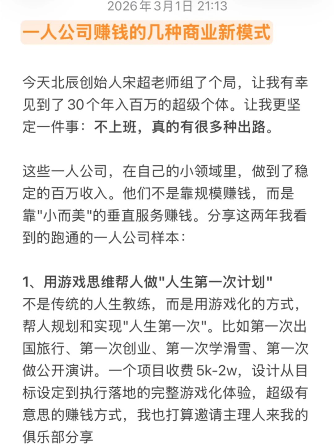 不是传统的人生教练,而是用游戏化的方式,帮人规划和实现"人生第一次"。比如第一次出国旅行、第一次创业、第一次学滑雪、第一次做公开演讲。超级有意思的赚钱方式,我也打算邀请主理人来我的俱乐部分享