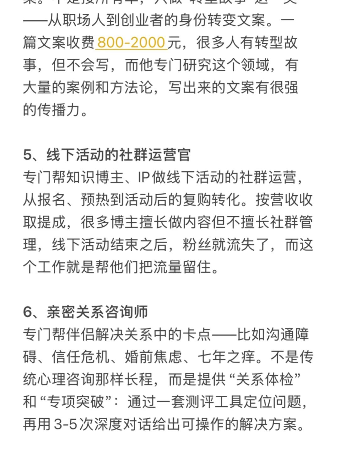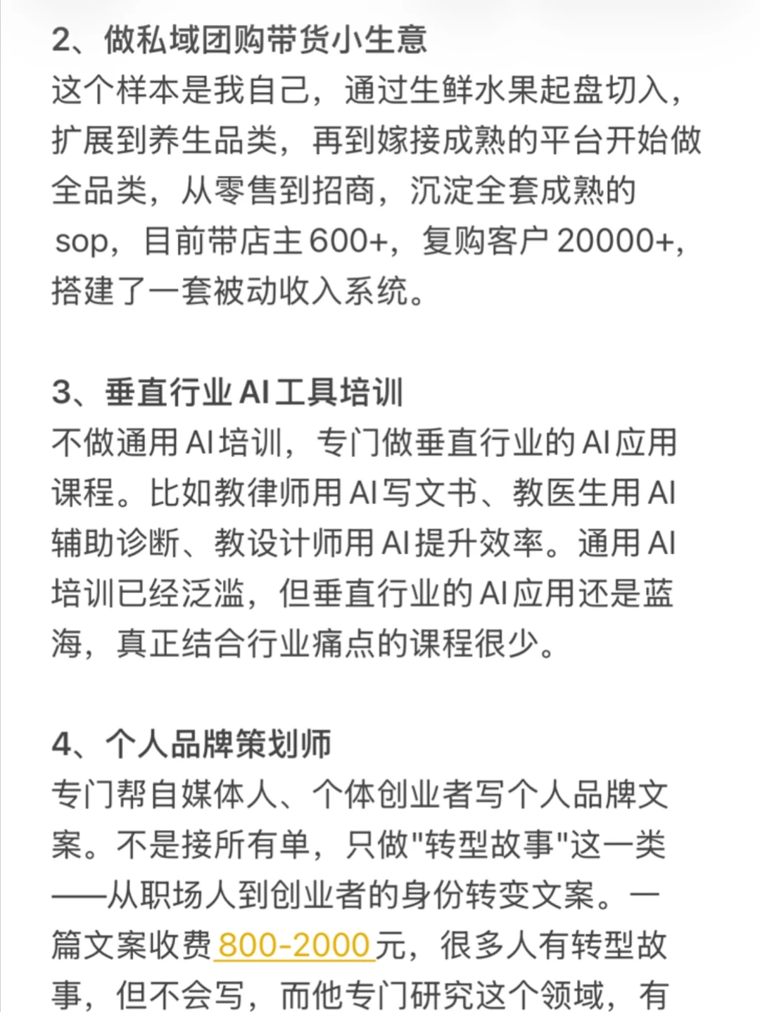 专门帮自媒体人、个体创业者写个人品牌文案。不是接所有单,只做"转型故事"这一类——从职场人到创业者的身份转变文案。很多人有转型故事,但不会写,而他专门研究这个领域,有大量的案例和方法论,写出来的文案有很强的传播力。