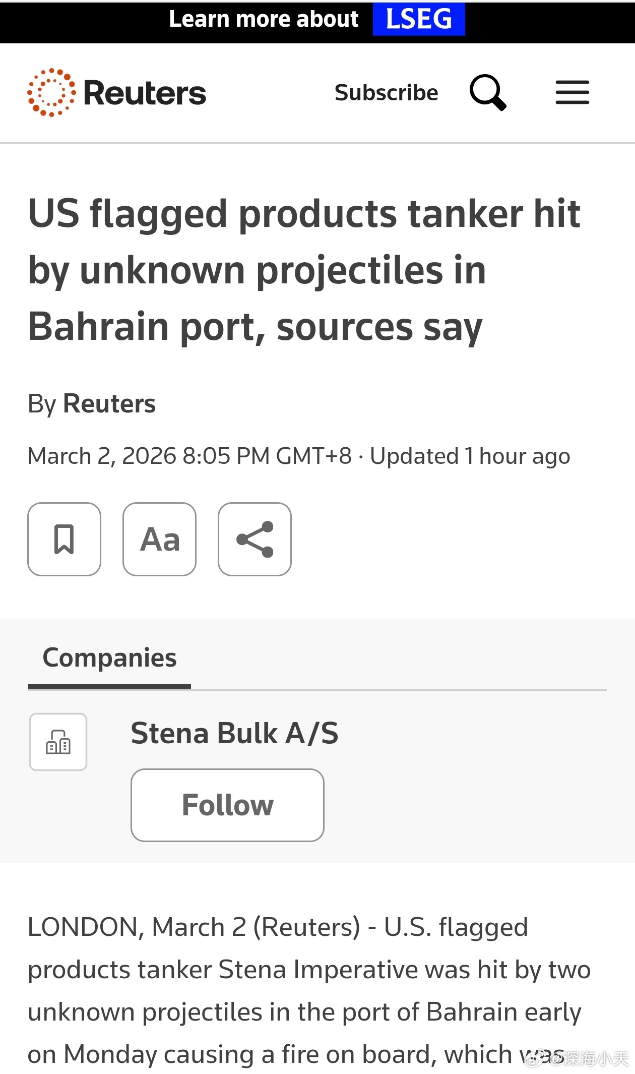 悬挂美国旗油轮被击中据路透社3月2日报道,船运消息人士2日称,一艘悬挂美国国旗的油轮在巴林港口停泊期间遭两枚不明来源的炮弹(抛射物)击中。伊朗最猛烈进攻下美国仅受轻伤4名美军士兵在对伊朗行动中身亡