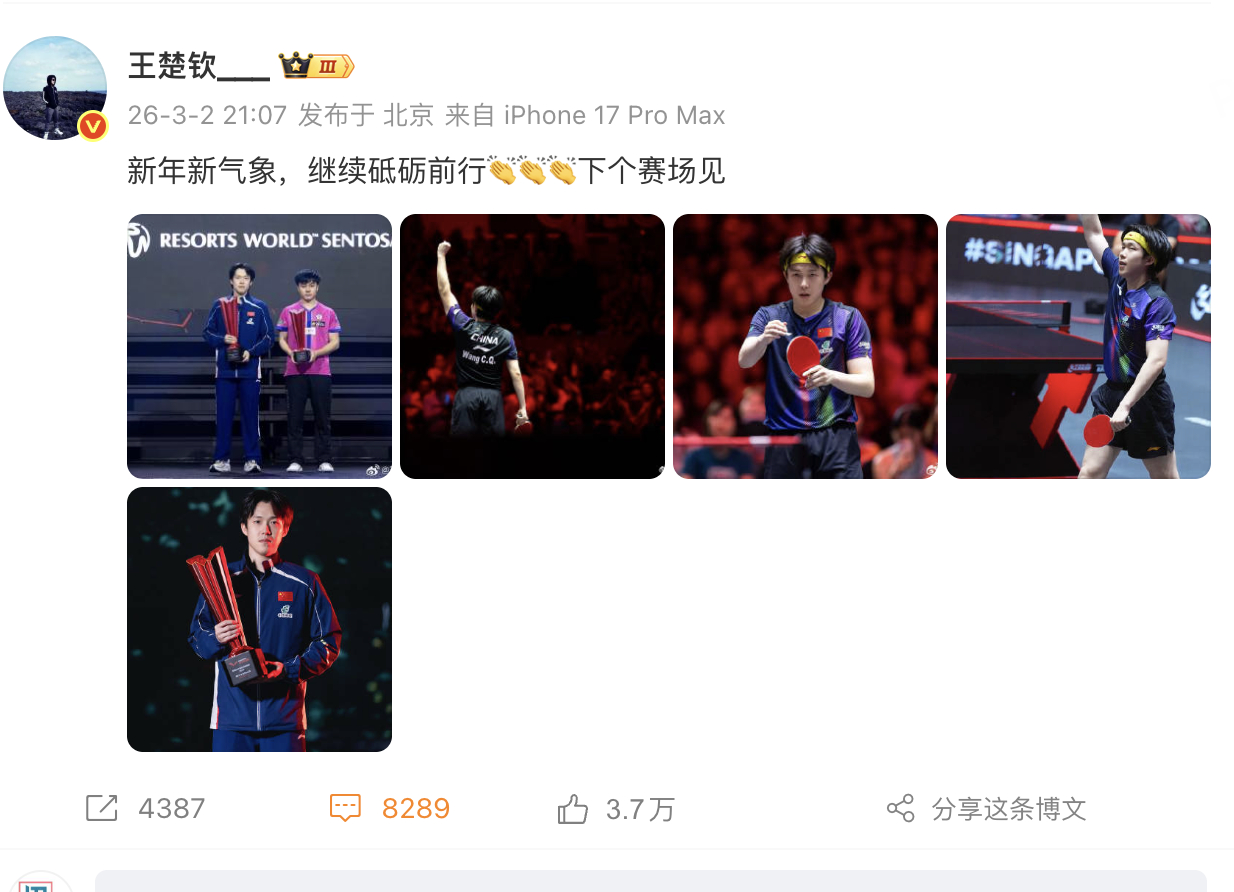 王楚钦说继续砥砺前行 刚刚夺得2026wtt新加坡大满贯的在社媒上发布了在本站赛事的高光照片,并配文“新年新气象,继续砥砺前行👏👏👏下个赛场见 ”