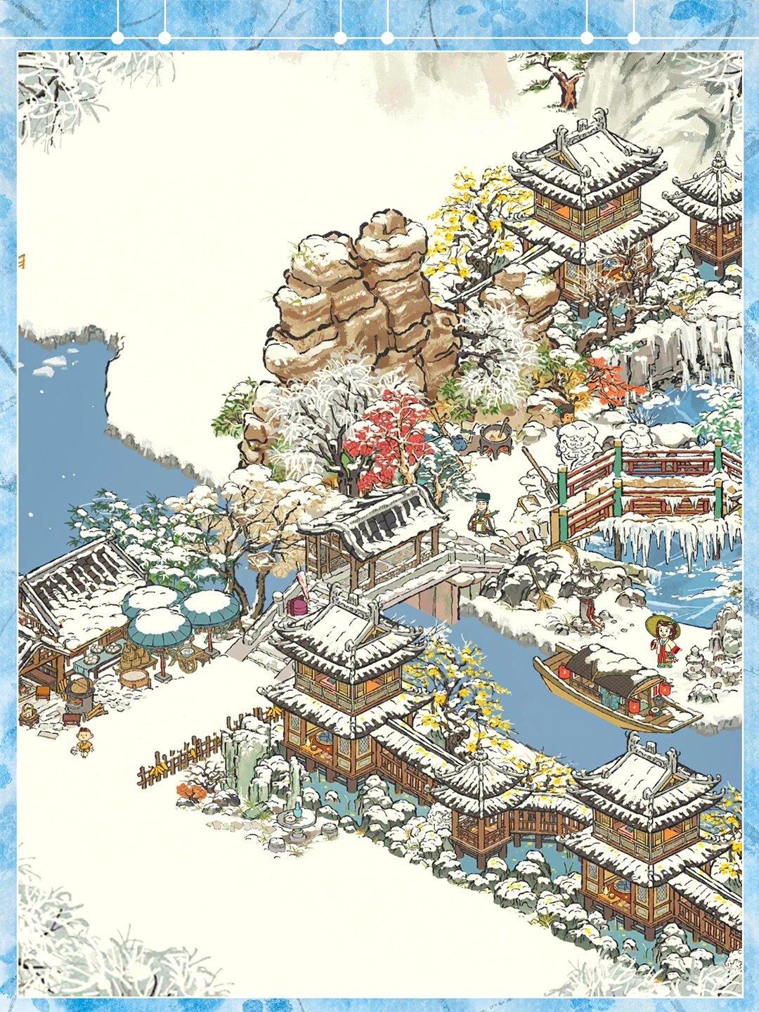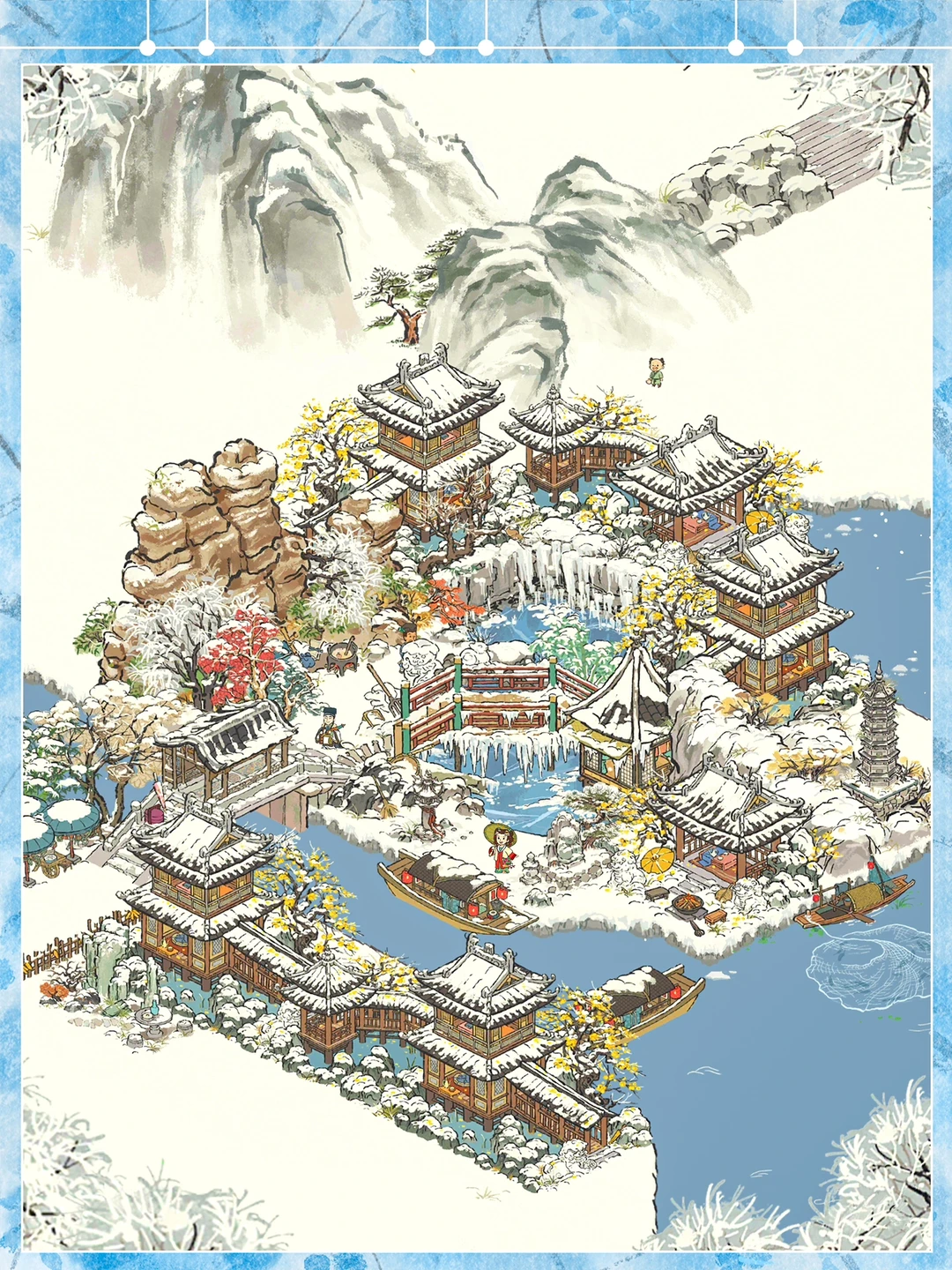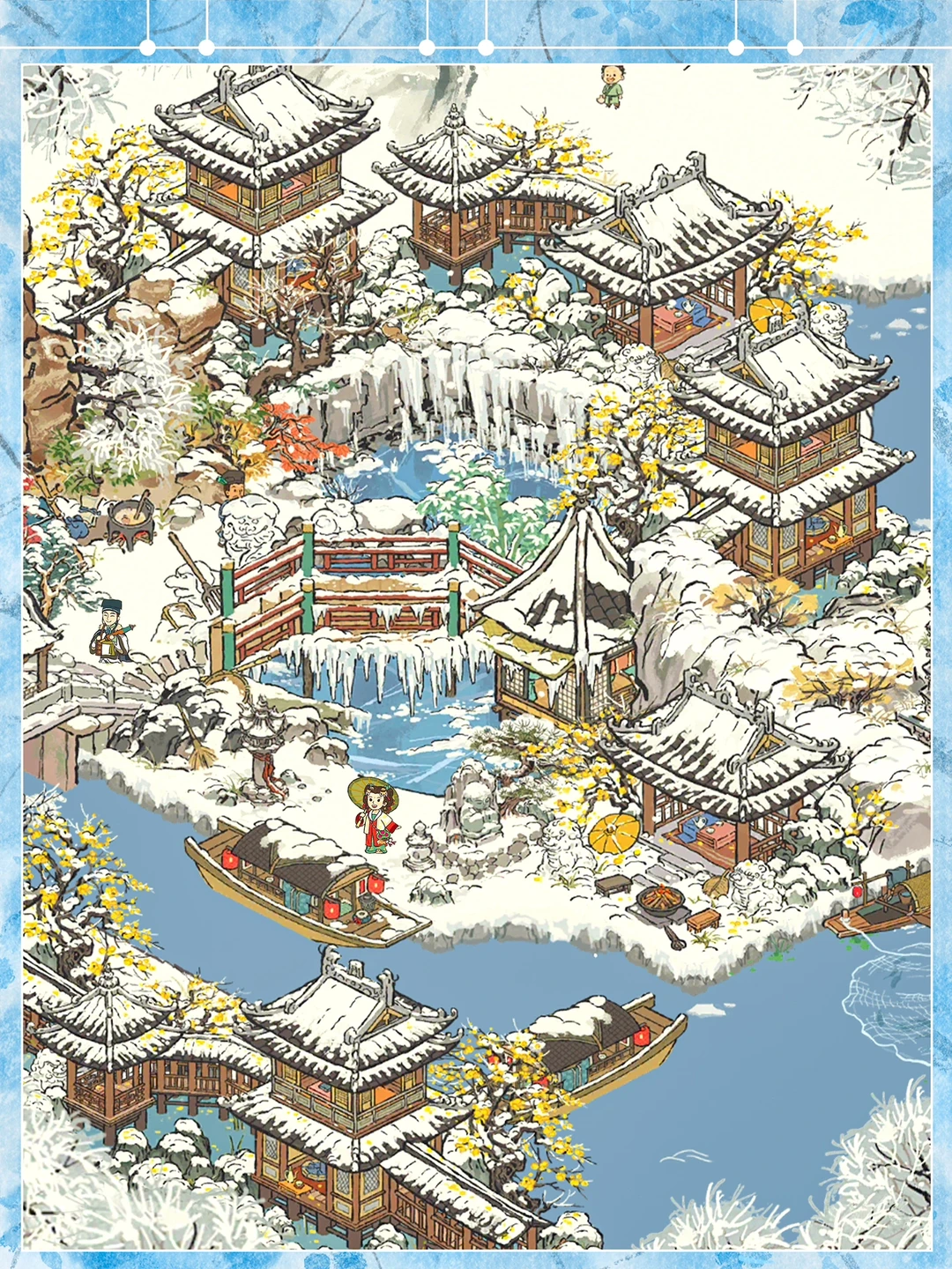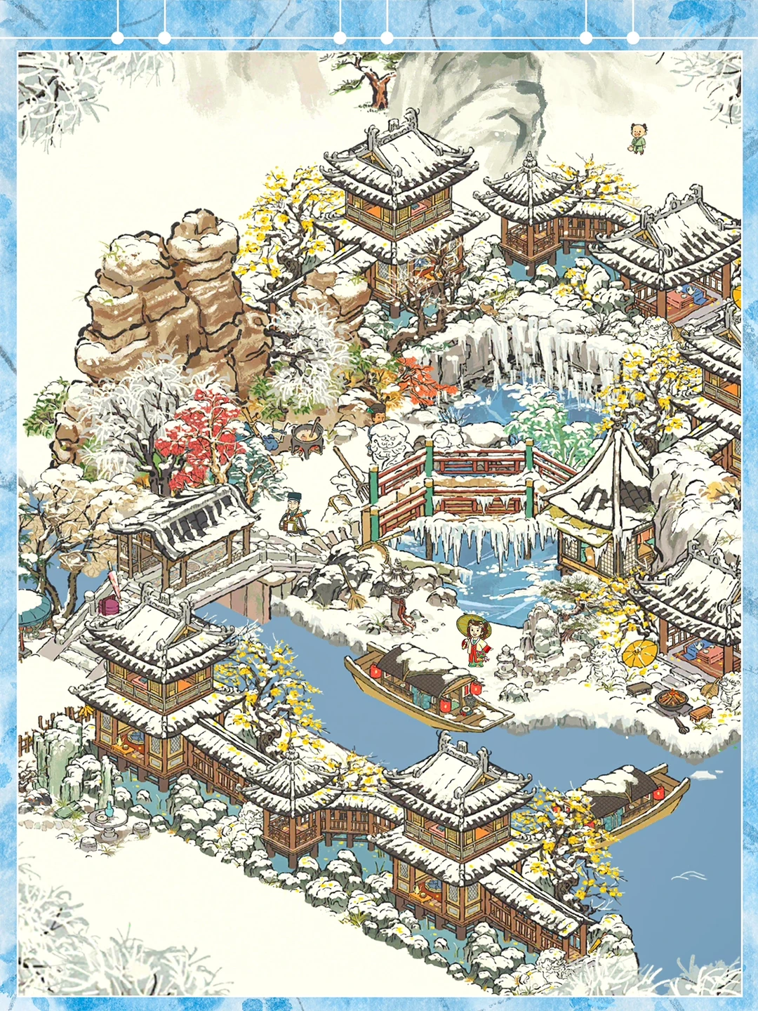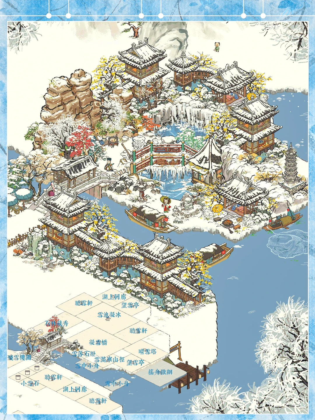 地点:白雪镇唱晚塘+月白塘 建筑:凝雪桥|雪落廊桥|听雪轩|湖上回廊|望雪亭|雪池凝冰|石林藏秀|晴雪塔|摇舟撒网|雪中小舟|残雪楼园|小雪石|雪满寒山径