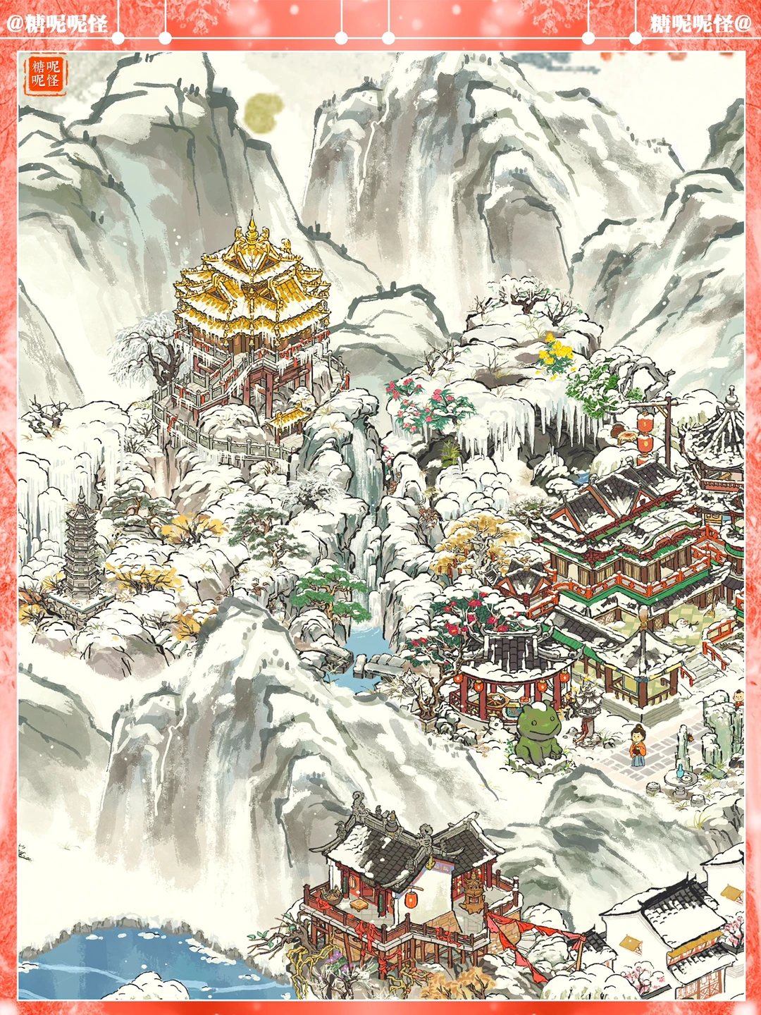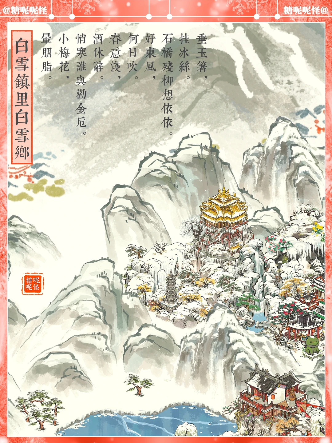 白雪镇雪景雪道塘布局 建筑:老君殿|凝晶门|一览峰|血池凝冰|獭聚温泉|雪峰藏渊|雪临丹阙