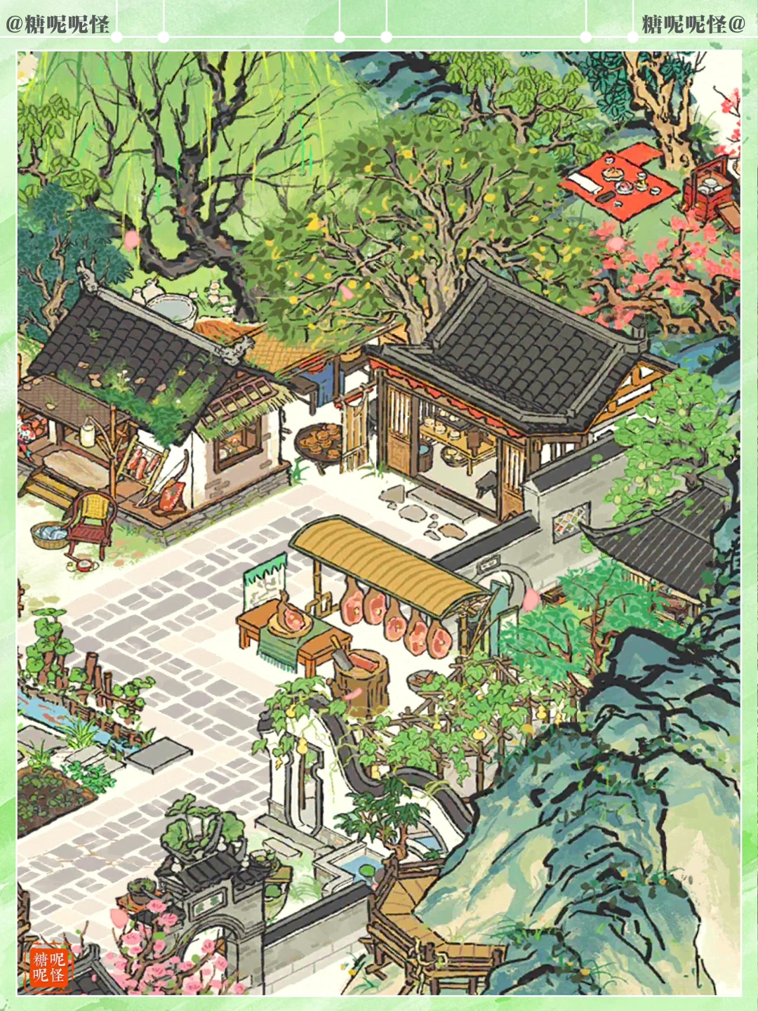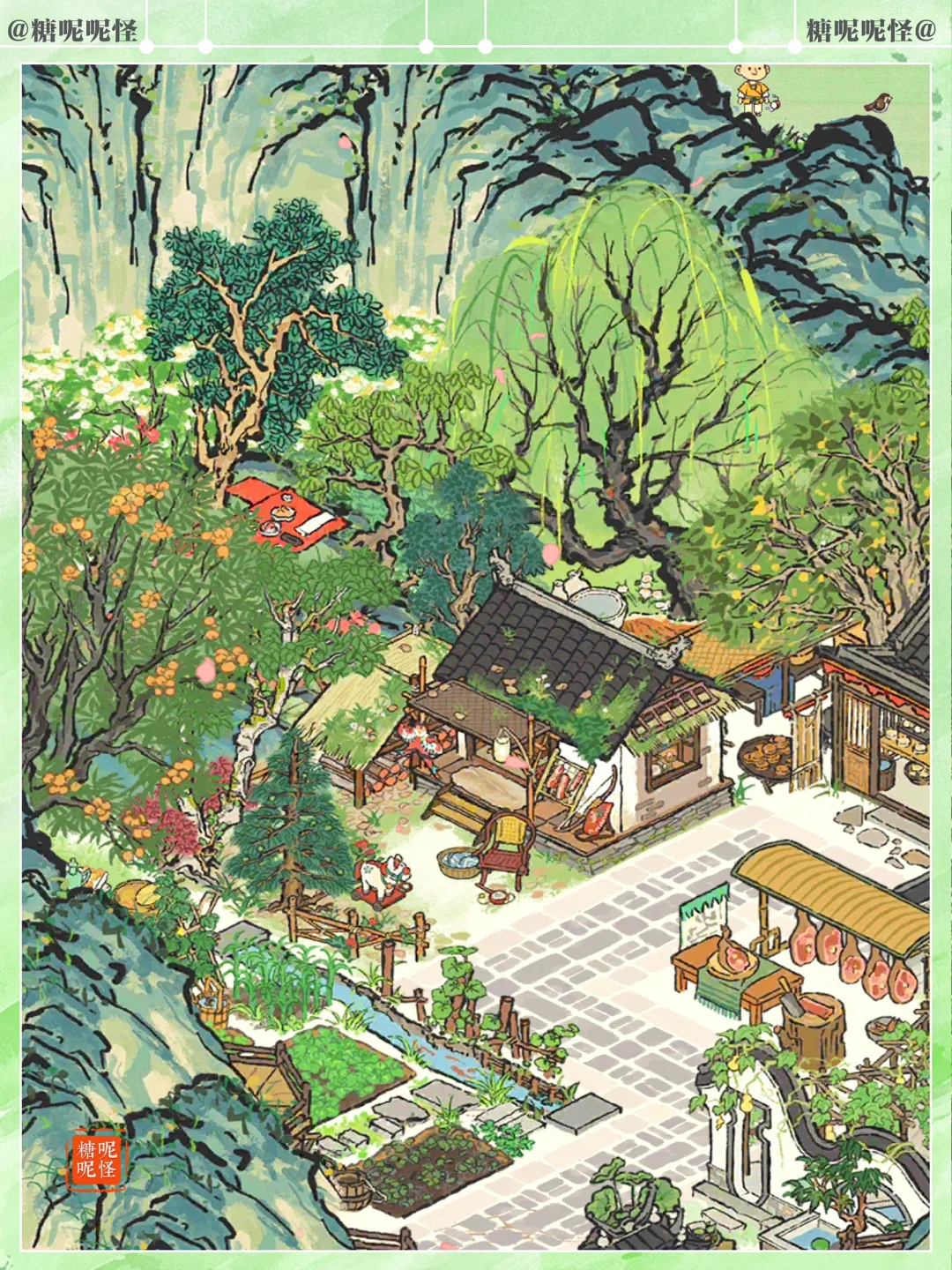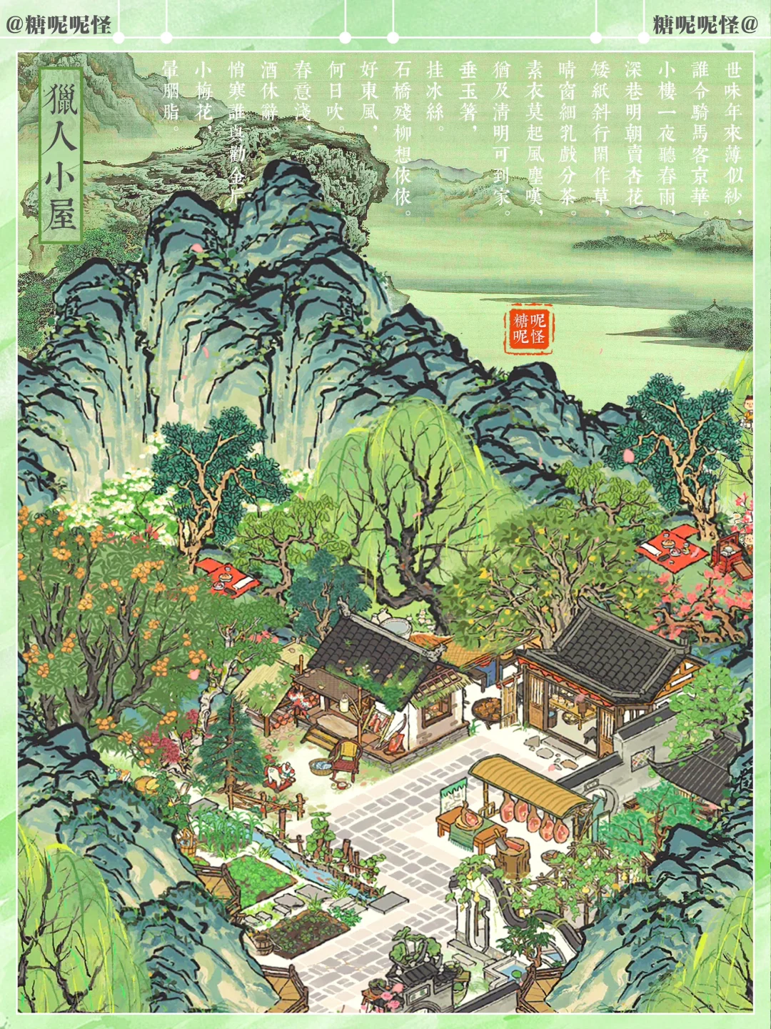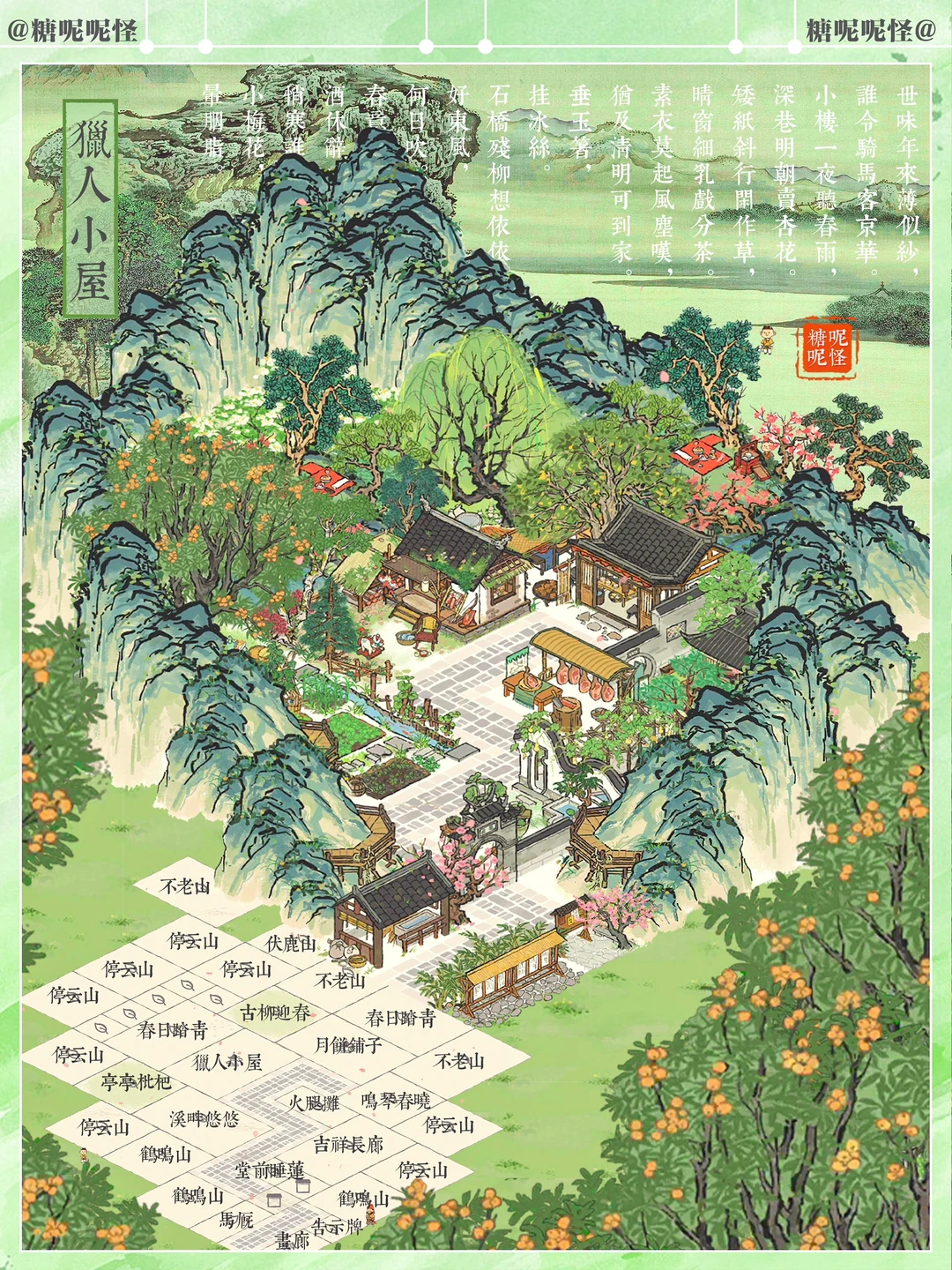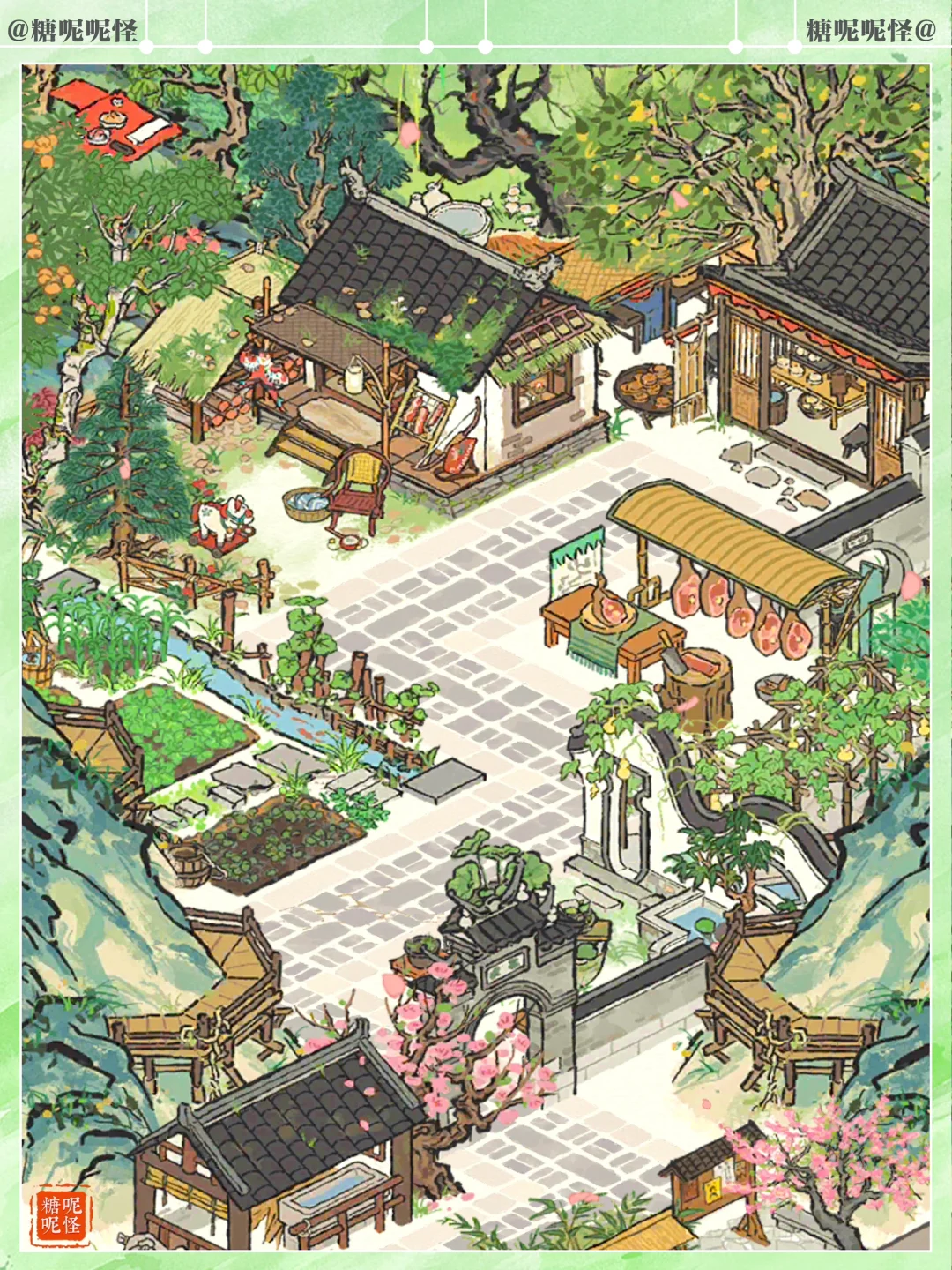 幽居山中的猎户家,顺便经营火腿月饼铺…… 每年中秋来临,猎户一家将最好的火腿肉拿出来,做成最好的月饼,拿到集市上去卖,顺便换些日用物件回山…… 听去过猎户家留宿的人说,猎户家是一处被山环抱的小山庄,大门口有拴马的马厩,院中有长廊、水池和小亭子,还有菜地,麻雀虽小 ,五脏俱全…… 细节感满满的免费小建筑,大家有没有拿到!!! 吹爆美工,【猎人小屋】和【溪畔悠悠】一样百搭又耐看!!1