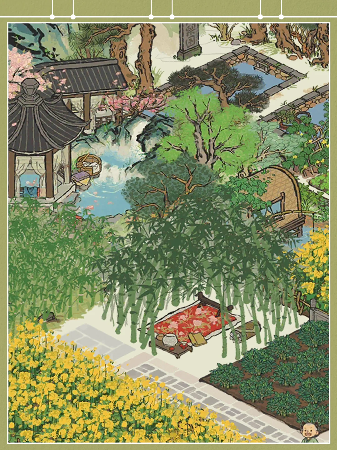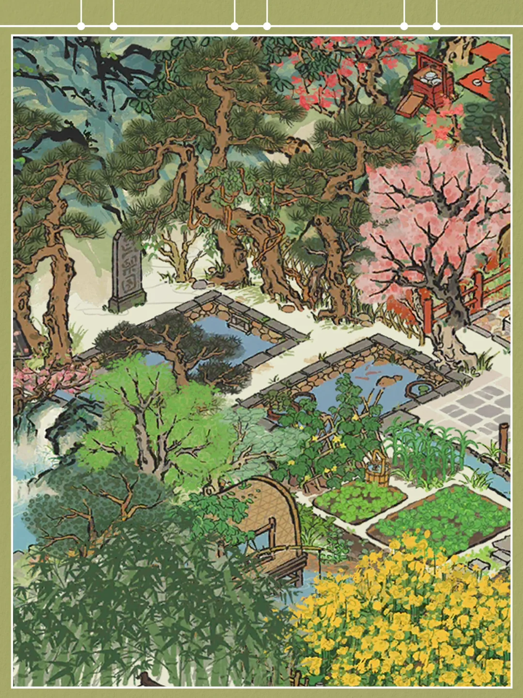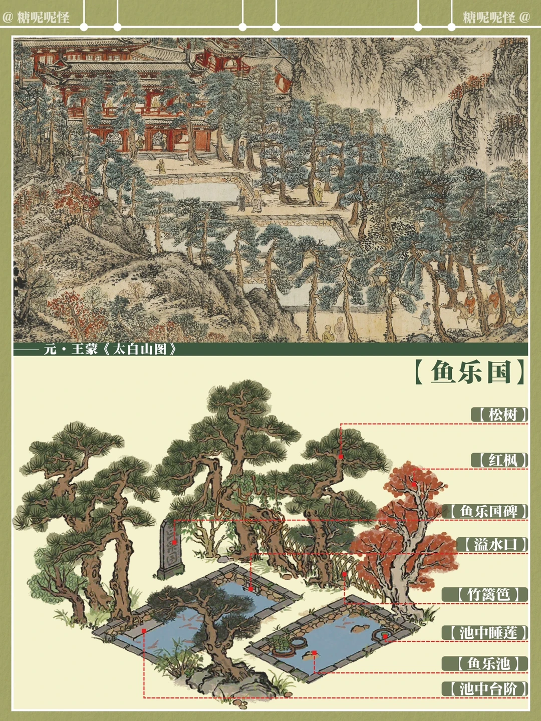 【鱼乐国】原型来源于元代王蒙的《太白山图》,图绘制浙江太白山天童寺一带的美景,其中主要是天童寺前面长达10公里的苍莽松林,松林苍郁茂密,寺庙楼阁,草堂屋舍,隐约可见。画面着色较重,山青叶红,一片山间田园秋景。 【鱼乐国】可见画作最后部分天童寺部分,古寺坐落于山谷之中,寺前秋池澄净,僧人悠游于松林庙宇之间。