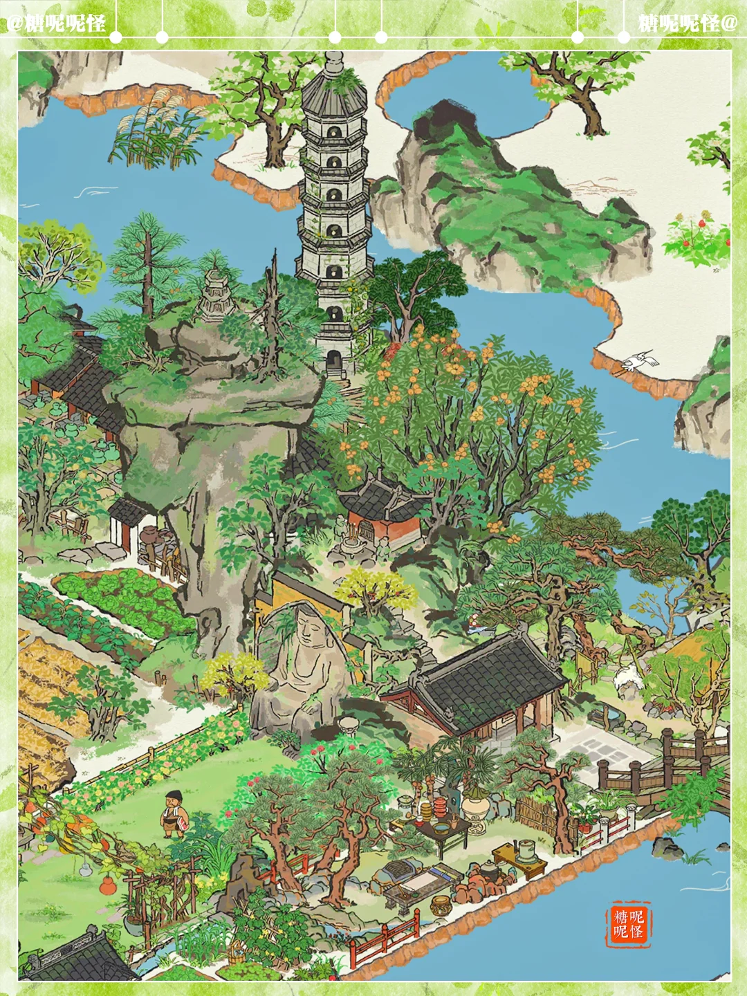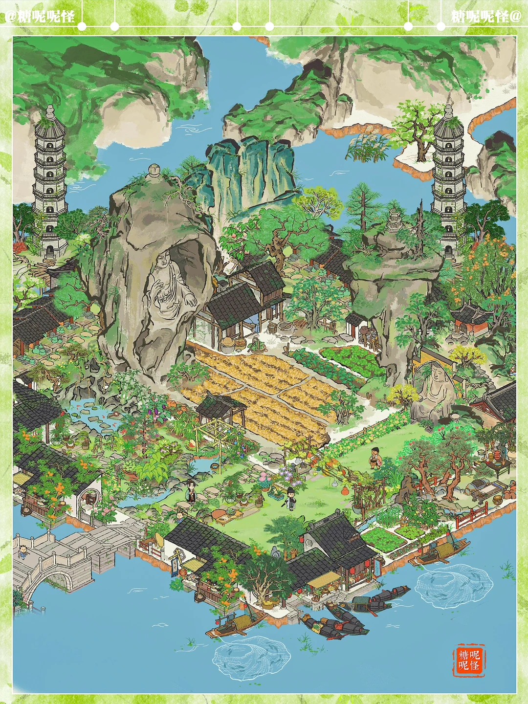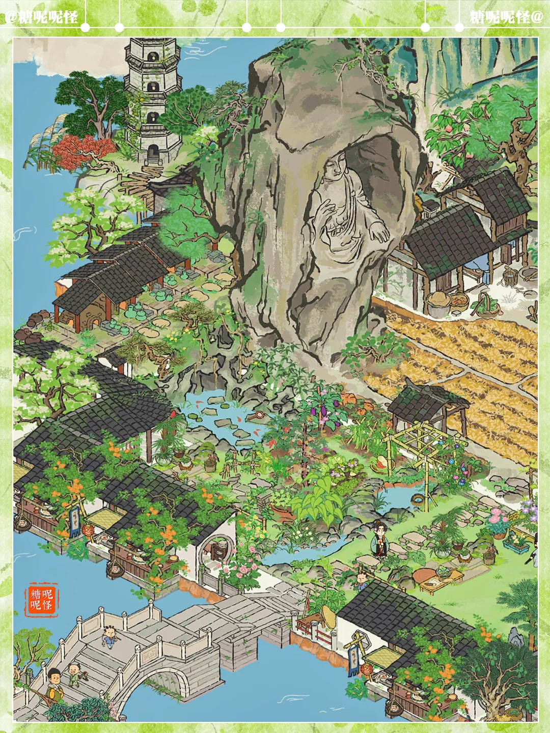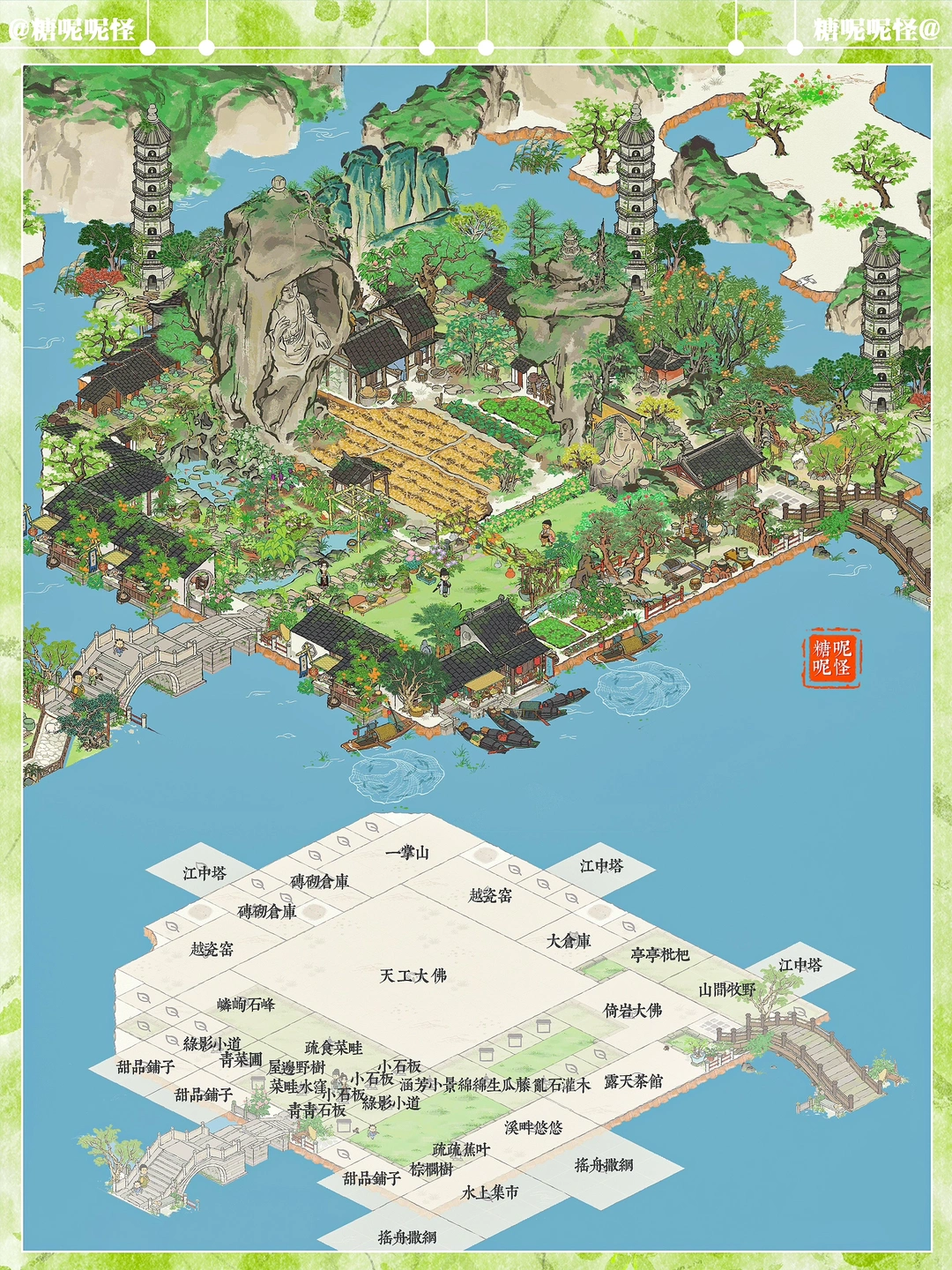 地点:绍兴府柯山桥区域 建筑:天工大佛|倚岩大佛|越瓷窑|亭亭枇杷|山间牧野|露天茶馆|疏食菜畦|砖砌仓库|甜品铺子|水上集市|摇舟撒网|江中塔|一掌山|嶙峋石峰|溪畔悠悠|绿影小道|菜畦水洼|青青石板|疏疏蕉叶|乱石灌木|涵芳小景 mhjh3embxr2