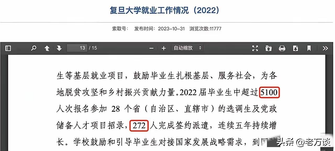 现在大学生就业越来越倾向于体制内了,连复旦大学这样顶级高校的学生都在备考公务员考试或者选调生。根据复旦大学 2022 年就业情况可知,该校在 2022 年共有 5100 人次毕业生参加了 28 个省市的的公务员考试或选调。要知道复旦大学作为国内顶尖的高校,学生就业一般都是在很不错的单位,比如跨国企业或者大厂,想不到这些学生现在都纷纷瞄上了公务员岗位。可能这样的考试人数以后还会越来越多,毕竟公务员岗位工作相对稳定,特别是选调生,晋升空间也比较大,而对于名校学生而言,具有更大的优势。对于理工科学生而言,这种人才更应该在科研机构推进科学技术发展岗位上发光发热,这样对于社会的发展作用才是更加的明显。