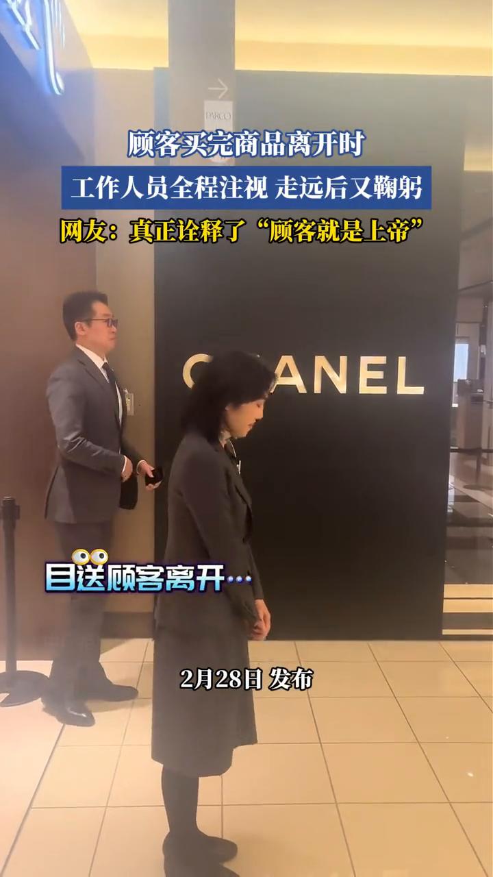 顾客买完商品离开时,工作人员全程注视走远后又鞠躬。网友:真正诠释了"顾客就是上帝"。 2月28日发布。目送顾客离开,中国柜姐什么时候能有这服务意识?高岛屋买戒指,一个人付钱,4个人收银,陪我聊天的。