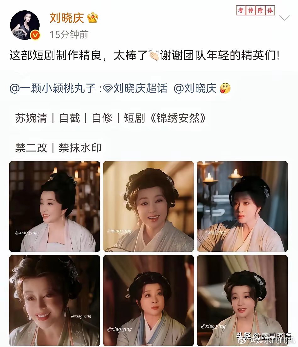 刘晓庆,连续发文!3月2日,75岁的刘晓庆,突然在社交平台连续发文,时差前后不超过2分钟,满是兴奋和得意,甚至情不自禁的夸了起来。原来刘晓庆此举是力挺自己主演的短剧《锦绣安然》,不仅夸“制作精良、太棒了”,还直言“这个角色为我的经典作品花园里又添了一朵非同凡响的花朵”,甚至自信表示“我演得也好,大赞!”,还主动推荐给大家,期待下一部。从粉丝晒出的剧照来看,刘晓庆饰演的苏婉清身着素雅古装,在精致妆造和柔光滤镜的加持下,皮肤状态显得紧致细腻,眼神也透着灵动,确实少了几分岁月痕迹。