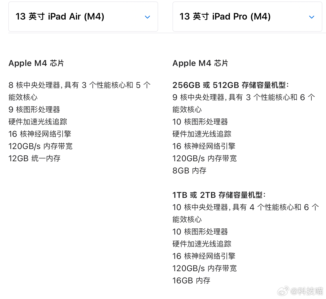 iPadAir芯片砍了三刀iPad Air 的 M4 芯片配置:8 核 CPU(3 个性能核心 + 5 个能效核心)9 核 GPU