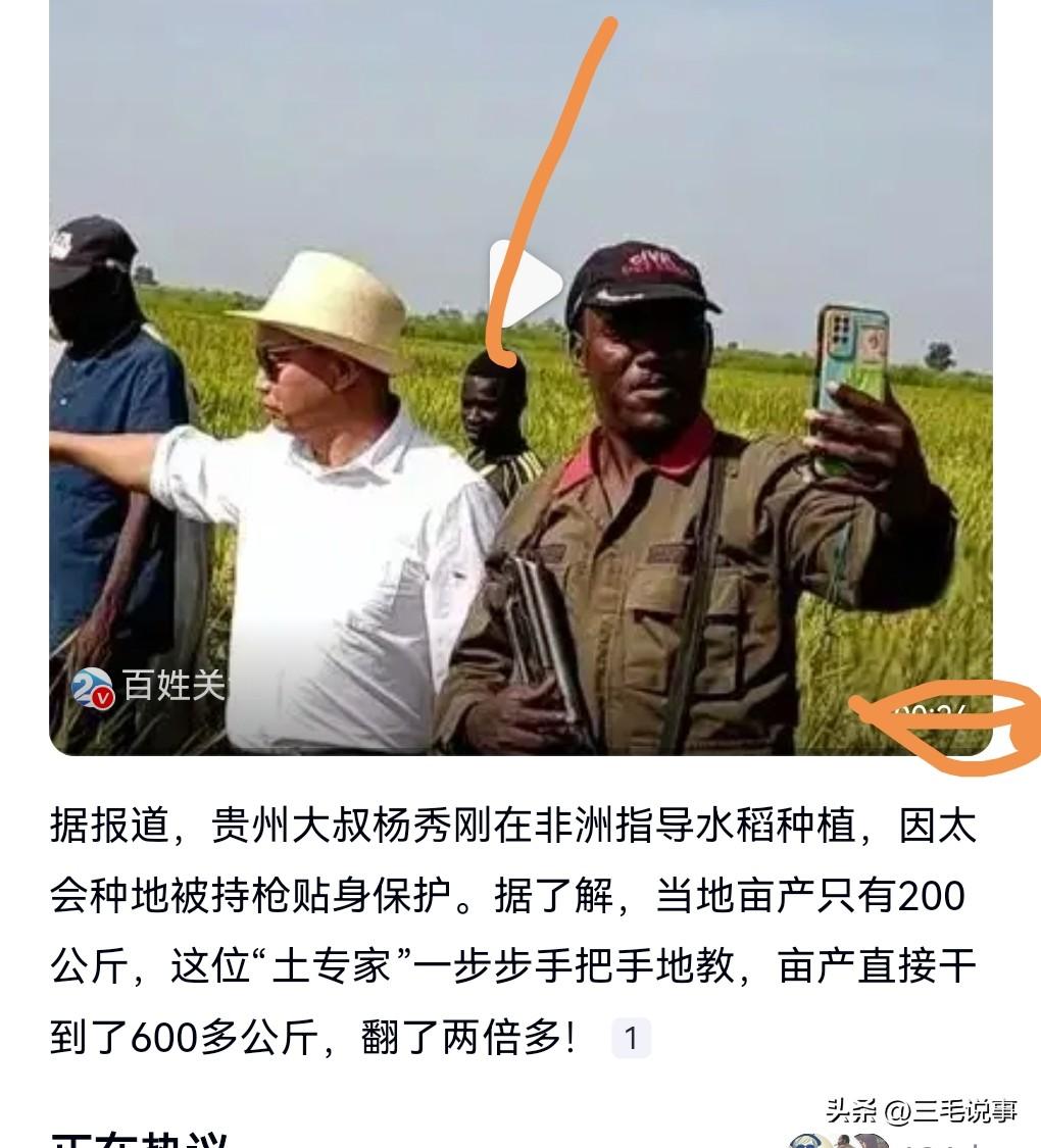这真的是太给力了。 3月3日热搜,中国大叔因太会种地在非洲被持枪保护。 可以看出当地的治安不太好,但是这样的专家也是极其珍贵的,必须要保护起来。 把当地的粮食产量从亩产200公斤提高到了亩产600公斤。 他的心愿就是要让非洲的老百姓有口饭吃。 中国对非洲国家的帮助,那真的是太大了。