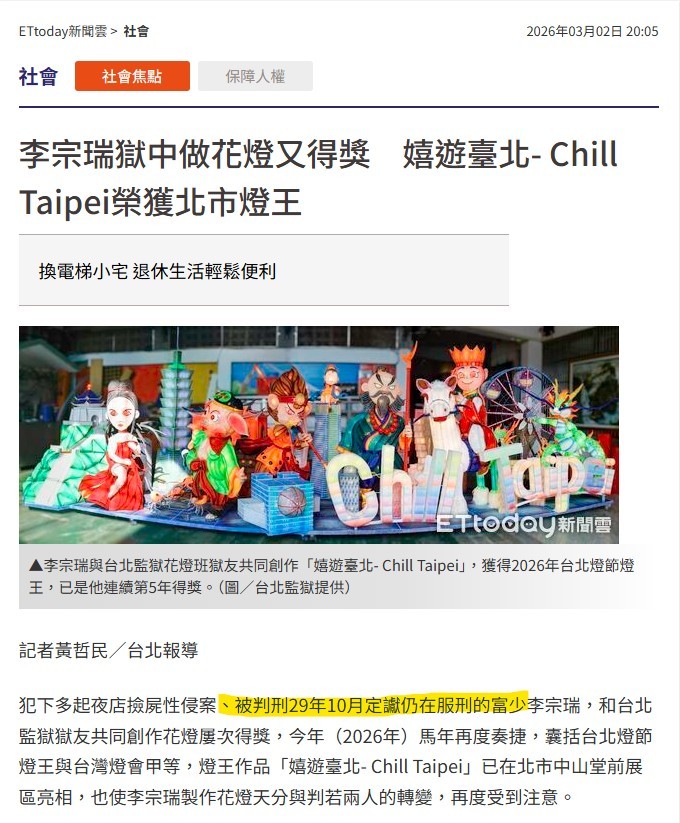 又得奖。。。每年元宵节台湾新闻必有淫魔李宗瑞的新闻。。。今年还给了title「北市灯王」= =
