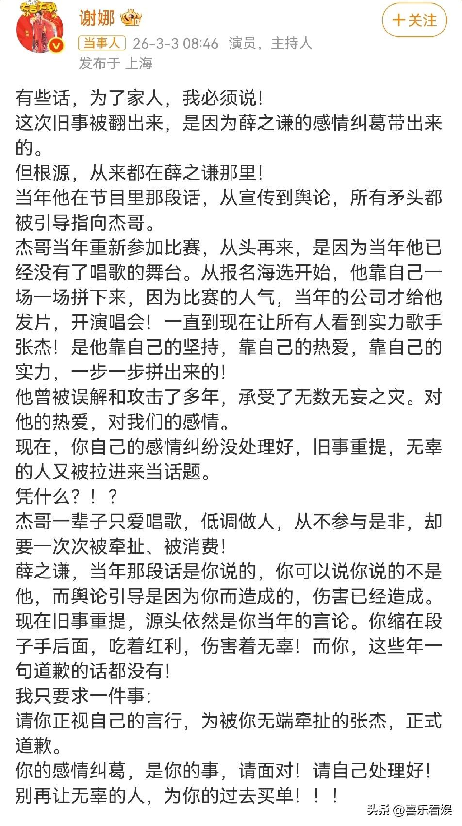 谢娜,怒了! 2017年,薛之谦在《吐槽大会》上,说了这么一段话:“ 作为一个名歌手,我没有提前解约,没偷没抢,没有找一个有钱的女朋友给我发唱片,没有找一个比我红的女朋友来辅助,红的堂堂正正。” 当年薛之谦的这段话,让不少网友猜测这是在内涵张杰。 张杰当时也因此被网暴了。 如今,这事也已经过去快十年了,没想到事情又再度被提起,张杰也又被拉出来议论。 原因是:昨天薛之谦的前女友李雨桐,又杠上薛之谦,并提到薛之谦曾说张杰唱歌土。 张杰也因此被挂上热搜,在网上被讨论了一番。 作为张杰妻子的谢娜,看到自己的老公又被拉出来讨论,忍了一天的谢娜,终于不忍了。 3月3日,谢娜愤怒发文,直接点名道姓“薛之谦”,喊话让薛之谦出来向张杰道歉。 谢娜表示,张杰之所以会被无端牵扯,一切的源头都在薛之谦,是他当年在节目上的话,还有没处理好的感情。 才让张杰再度被拉出来消费。 此外,谢娜还表示:张杰有今天的成就,都是靠自己一步一步打拼出来,并没有靠谁。 对此,你们怎么看?