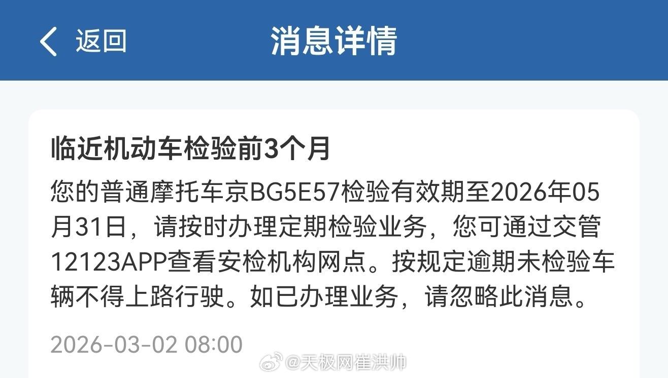 要不是12123提醒,我都快忘记还有辆摩托车呢!两年没骑怕是都打不着火了,等开春把车好好收拾一下。摩托车摩托车年检