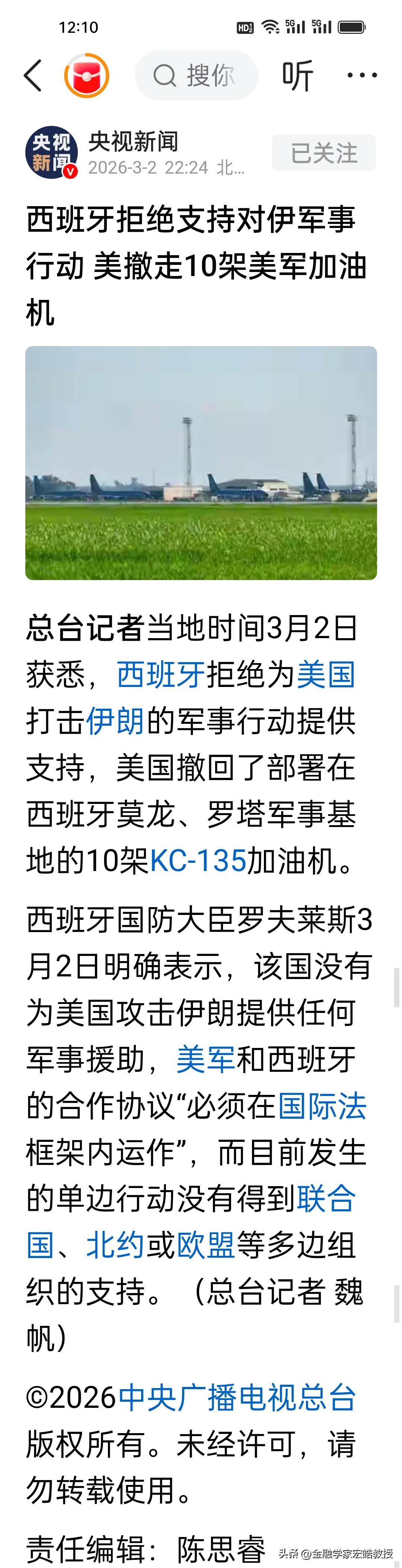 西班牙硬刚美国,英国秒变“墙头草”?主要有三大原因! 谁也没想到,这次西班牙出乎意料的硬气怼美国。西班牙国防大臣罗夫莱斯3月2日撂下硬话:拒绝为美国打击伊朗提供任何支持,美军10架KC-135加油机连夜撤离莫龙、罗塔基地,截至目前,美国也没有对于西班牙这种做法的任何声明,把西班牙冷处理。同是北约盟友,英国首相斯塔默却24小时内反转立场,甘愿当美国附属,背后藏着三层深层博弈: 1️⃣ 主权与法理的底线之争:西班牙此次坚守《联合国宪章》,明确单边行动无联合国、北约授权,拒绝让基地沦为美伊战争工具;主权归属决定其绝不妥协,西班牙也不想帮美国背锅,这是马德里拒绝配合的核心底气。 2️⃣ 政治与利益的精准权衡:西班牙聚焦国内民生,不愿卷入美伊冲突推高能源成本;英国则依附美国战略,斯塔默政府需通过“集体自卫”的名义巩固盟友关系,弥补自身国际影响力的短板。 3️⃣ 地缘与现实的能力差异:西班牙背靠欧盟核心,有底气抗衡美国施压;英国脱欧后孤立感加剧,对美国军事依赖更深,同时缺乏西班牙的区域话语权,只能选择妥协。 不得不说,这次西班牙确实特立独行,一刀斩断美军“空中补给线”,用主权敲醒霸权;英国的摇摆则暴露了欧洲盟友的真实立场——战争从来不是单边邀约,主权与法理,才是对抗强权的终极武器。