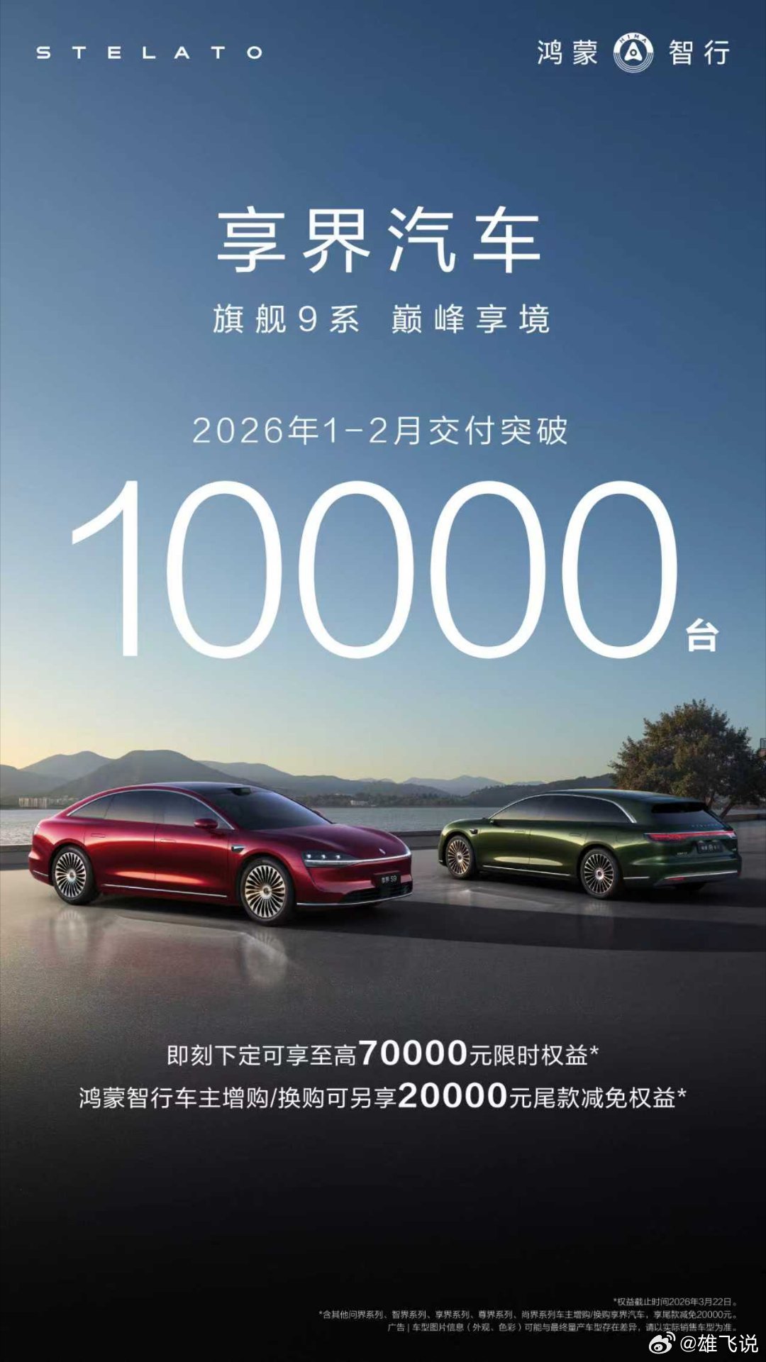 按照华为鸿蒙智行刚刚公布的最新数据显示,享界汽车2月交付4627台 ,2026年1-2月累计交付突破10000台。