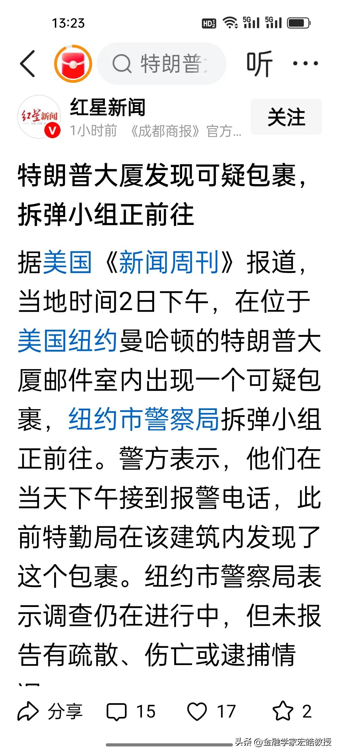 突发!特朗普这么快就遭到反噬了?昨天伊朗刚放出针对特朗普一家的无人机复仇海报,刚刚,纽约特朗普大厦邮件室就惊现可疑包裹,拆弹小组紧急赶赴。 一边是特朗普自诩“一年轰炸8国”的强硬姿态,一边却是自家核心领地先遇惊魂。这种“前脚放狠话,后脚遇状况”的节奏,堪称现实版“报应”现场。 拆弹现场目前未报伤亡,但这枚包裹本身就是一记重击。特朗普打别人的时候,或许没想过:当战火烧向特朗普的家门口,当对手从隐忍转为直面,美国的安全屏障,早已在单边冲动中千疮百孔。 玩火者,终必自焚。这不是偶然,是霸权逻辑的必然反噬。