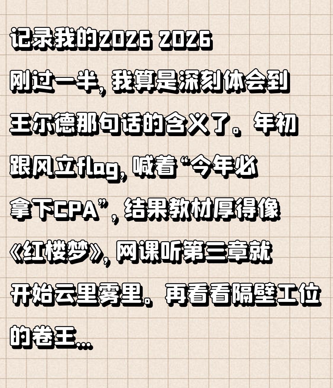 记录我的2026 2026刚过,我算是深刻体会到王尔德那句话的含义了。年初跟风立flag,喊着“今年必拿下CPA”,结果教材厚得像《红楼梦》,网课听第三章就开始云里雾里。再看看隔壁工位的卷王,每天七点到公司背考点,我九点进门时人家真题都刷完一套了。我调侃他想卷死我们继承工位,他还搬出《教父》台词。 五月出差也没捞着清闲,客户是个“细节控”,PPT改到第五版,就因为标点符号用错,又得返工。这半年,卷不动的焦虑和躺平后的空虚,我算是全占了,也不知道下半年能不能有点转机。