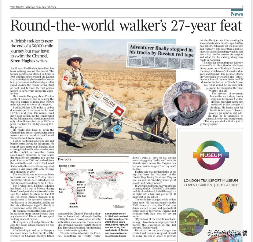 1998年,因为一次赌约,英国人卡尔·布什比从智利蓬塔阿雷纳斯出发,立下了一个雄心勃勃的计划:徒步返回英国,全程不使用任何交通工具。25多年过去了,他已经跋涉了超过3万英里,穿越了沙漠、丛林、山脉,甚至冰封的白令海峡。地缘政治、天气和签证限制等因素导致他的旅程被拖延了数十年,截至 2026 年 3 月,英国探险家卡尔·布什比(Karl Bushby)正处于其长达 27 年的“歌利亚远征”(Goliath Expedition)最后阶段。根据 2026 年初的最新进展: 当前位置:卡尔计划于 2026 年 3 月 在 匈牙利与奥地利边境 附近重新恢复徒步。他在 2025 年底已抵达匈牙利的杰尔(Gyor),随后因签证要求暂时前往墨西哥修整,现已按计划返回欧洲开启最后一段行程。 近期成就:他在 2024 年完成了一项惊人壮举——在无法获得俄罗斯或伊朗陆路签证的情况下,耗时 31 天横渡里海(约 288 公里),从而进入欧洲境内。 后续路线:他将从奥地利出发,继续向西北方向穿越欧洲大陆,最终计划通过英法海底隧道(徒步通过服务隧道)返回英国。 预计完赛时间:如果一切顺利,卡尔预计将于 2026 年 9 月 抵达他的家乡——英国赫尔河畔金斯顿(Hull),正式结束这场始于 1998 年、跨越约 58,000 公里的全球徒步。