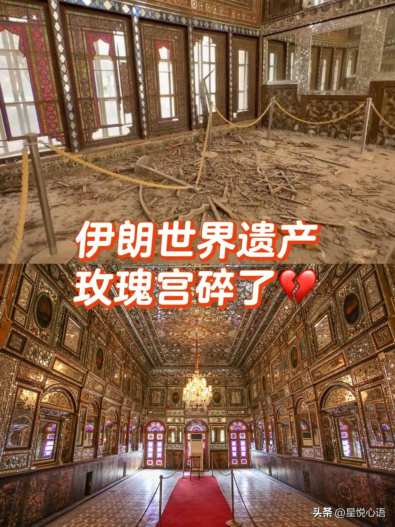 伊朗玫瑰宫破碎了,太可惜了💔 这哪是一座普通宫殿,是伊朗的“故宫”啊!18世纪卡扎尔王朝的王宫,巴列维父子的加冕都在这办,2013年就成了世界遗产,藏着波斯数百年的历史。 它的美是独一份的,彩釉瓷砖贴满外墙,石膏雕花精致到骨子里,最绝的明镜殿,满墙满顶的细密镜面,是波斯工艺的巅峰,流光溢彩的样子想起来就惊艳。 3月2日的袭击里,窗框、木门全坏了,镜面装饰碎了一地,这些损毁都是不可逆的!哪怕馆内文物提前转移,可建筑本身的硬伤,再也补不回来了。 好多人说还没来得及去看看,这份遗憾真的太可惜人。想起巴米扬大佛的悲剧,文化遗产从不是一个国家的事,是全人类的共同财富啊,怎么经得住战火的摧残。 只愿世界和平吧,别再让这些跨越百年的美好,毁在硝烟里了,每一座古迹的消失,都是全人类的损失!