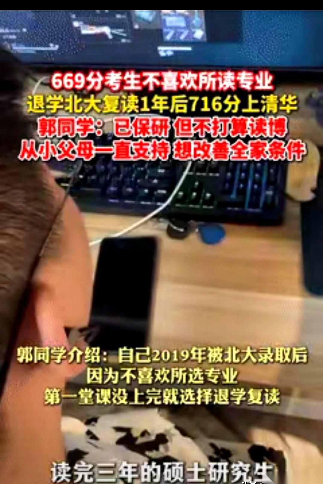 我嘞个去,这小子简直是个人间清醒啊!669分上的北大医学部,第一节课没上完,扭头就退学复读,然后考了716分,进了清华的工科!这操作,我是服气的,真的。 你敢信?北大啊!多少人做梦都想进去的殿堂,他进去逛了一圈,发现不对味,直接拍屁股走人。就因为课堂上老师讲的那些专业术语和案例让他“越听越懵”,心里抵触得厉害。说白了,就是:老子不喜欢!我以前以为学医稳定,那是我被忽悠了。 换谁,家里人都得炸锅吧?尤其是父母供着你读书不容易。但郭恩惠这小伙子,家里条件一般,父母都是老实巴交的农民,结果他父母还挺住了,没骂他“败家子”,还支持他去追自己喜欢的。这得是多大的信任和爱啊?我当时看到这里,真的有点眼眶湿湿的。 一年,又一年,从北大的光环里跳出来,去埋头苦读,就为了追自己真正想做的事。这不就是电影里才有的情节吗?结果人家还真考上了清华工科,保研了都!你说这人,脑子是怎么长的? 最牛的是,他保研后还不读博,说是家里条件不好,想早点赚钱让父母过好日子。你看,这不就是咱们身边最真实、最朴素的孝顺吗?不是为了所谓的“高学历”光环,而是为了家里的那份责任。 好多人说他任性,浪费时间。我倒觉得,这哪是任性啊,这叫对自己的人生负责!比那些明明不喜欢,还在某个岗位上混日子、怨天尤地的人,清醒了不知道多少倍。名校是块敲门砖,但敲开了门,你还得知道自己想往哪屋走,不然,金光闪闪的门票也只是个摆设。 现在这社会,多少年轻人被所谓的“稳定”绑架,活成了别人眼中的样子?像他这样,敢于跳出来,敢于去追自己内心的热爱,并且真的做到了,简直就是给我们打了一剂强心针!告诉我们,路不是只有一条,敢闯,就有活路。活得清醒,活得真实,真好!
