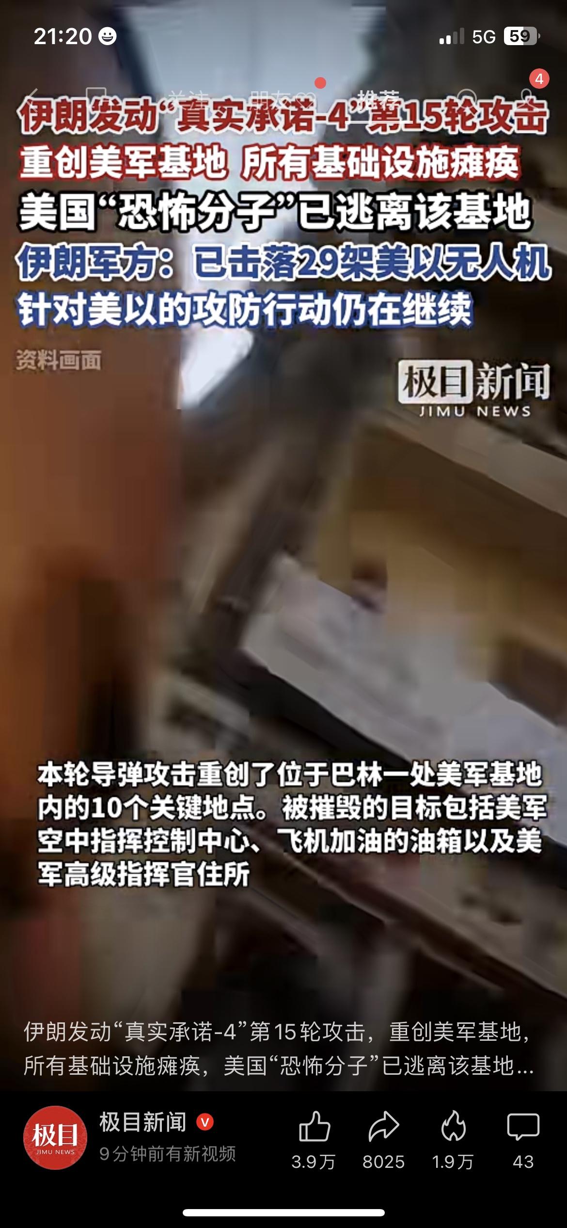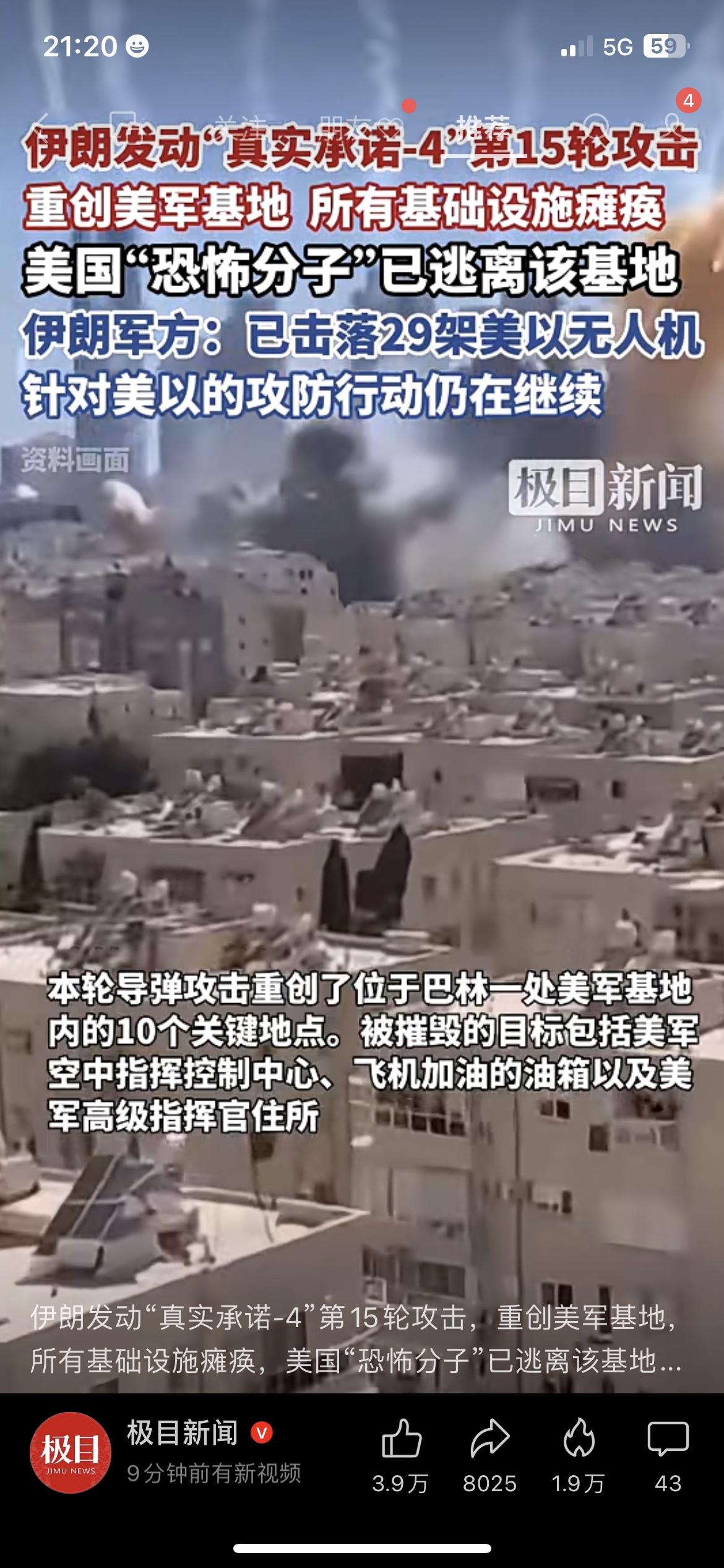 我刚刷到这条消息,整个人都看愣了。 伊朗“真实承诺-4”第15轮攻击正式打响,巴林美军基地被彻底瘫痪,人员全部撤离。 伊朗军方直接官宣:已经击落29架美以无人机,反击还在继续。 这次打击精准命中指挥中心、油库、指挥官住所等10个关键点位。 我朋友今晚一直在刷局势,看完直说:“这么打下去,油价和股市真要扛不住了。” 局势越演越烈,每一步都牵动着全球市场,也牵动着咱普通人的钱袋子。 你觉得这场冲突会快速降温吗?评论区说说你的看法。 中东冲突 伊朗反击 美军基地 国际局势美军攻打伊朗 美国对伊朗空袭