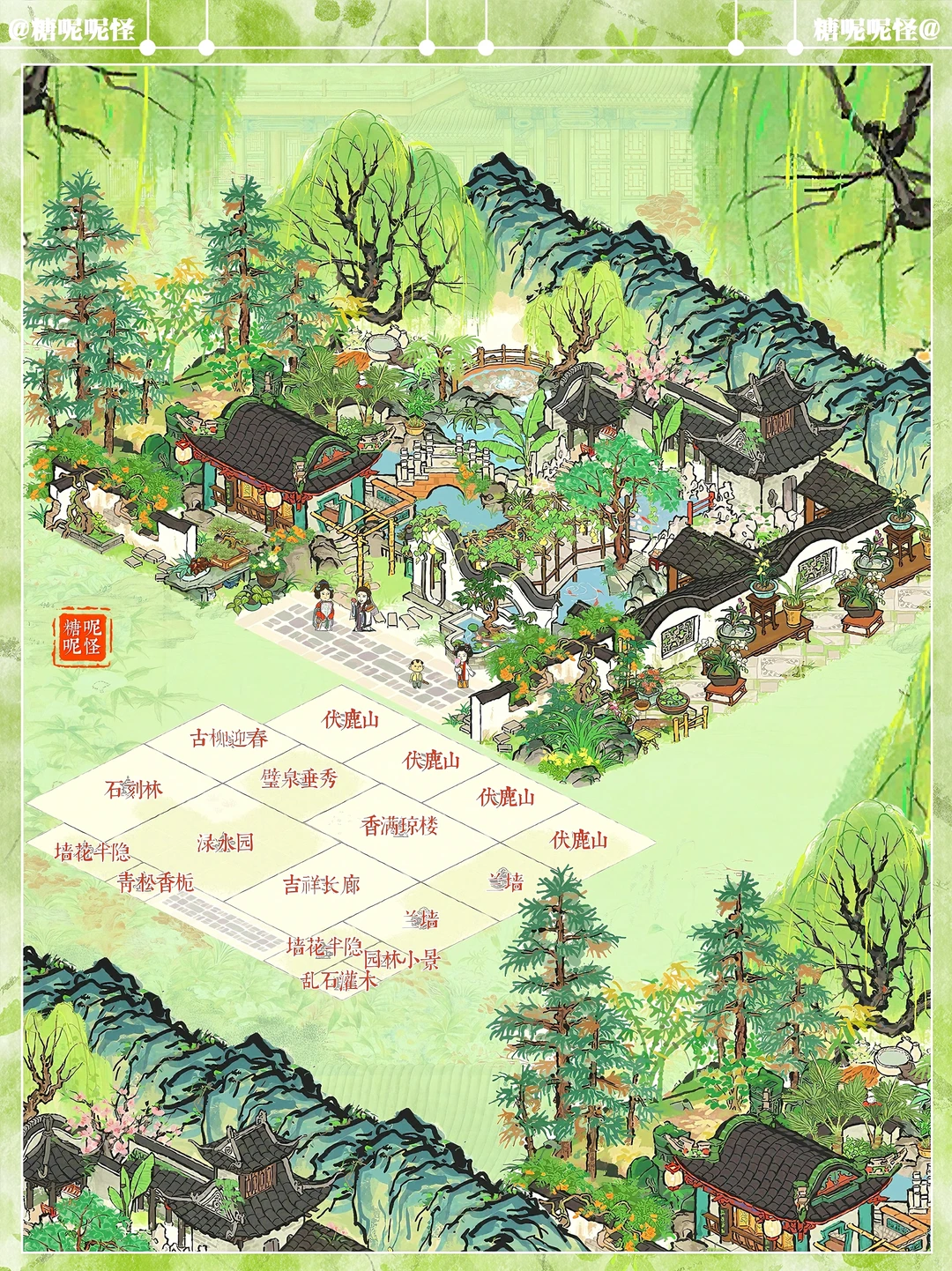 建筑:渌水园|吉祥长廊|香满琼楼|璧泉垂秀|石刻林|伏鹿山|兰墙|墙花半隐|古柳迎春